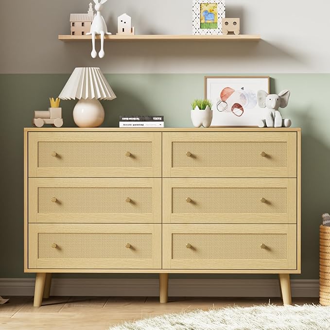 - Let the glamour of mid-century design enhance your living space. Adorned with woven rattan, slanted legs and gold knobs, this 6-drawer dresser is a stylish addition to your home. Whether on its own or paired with other HOUROM pieces, it brings a hint of elegance.