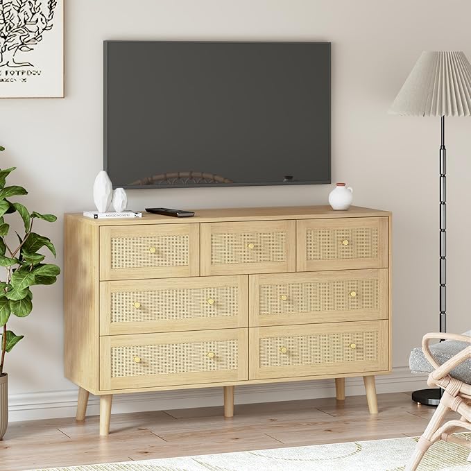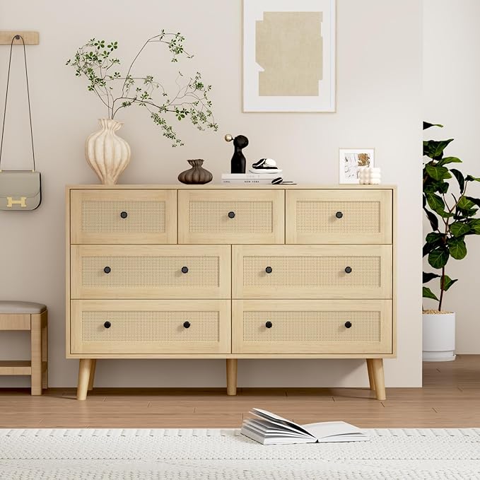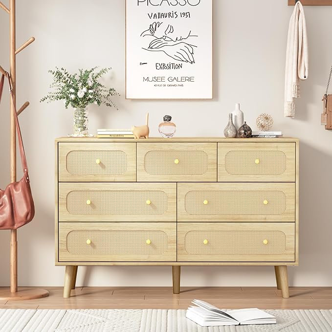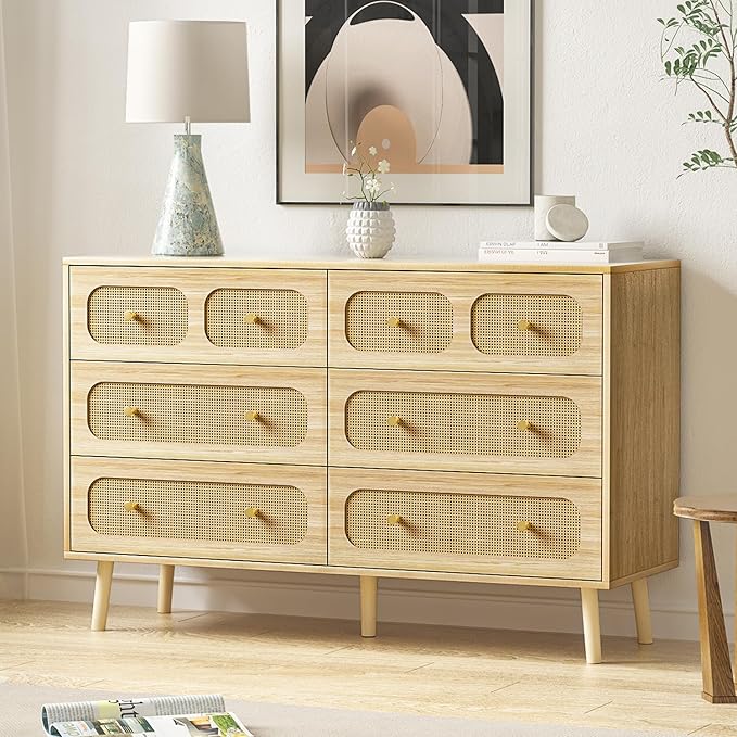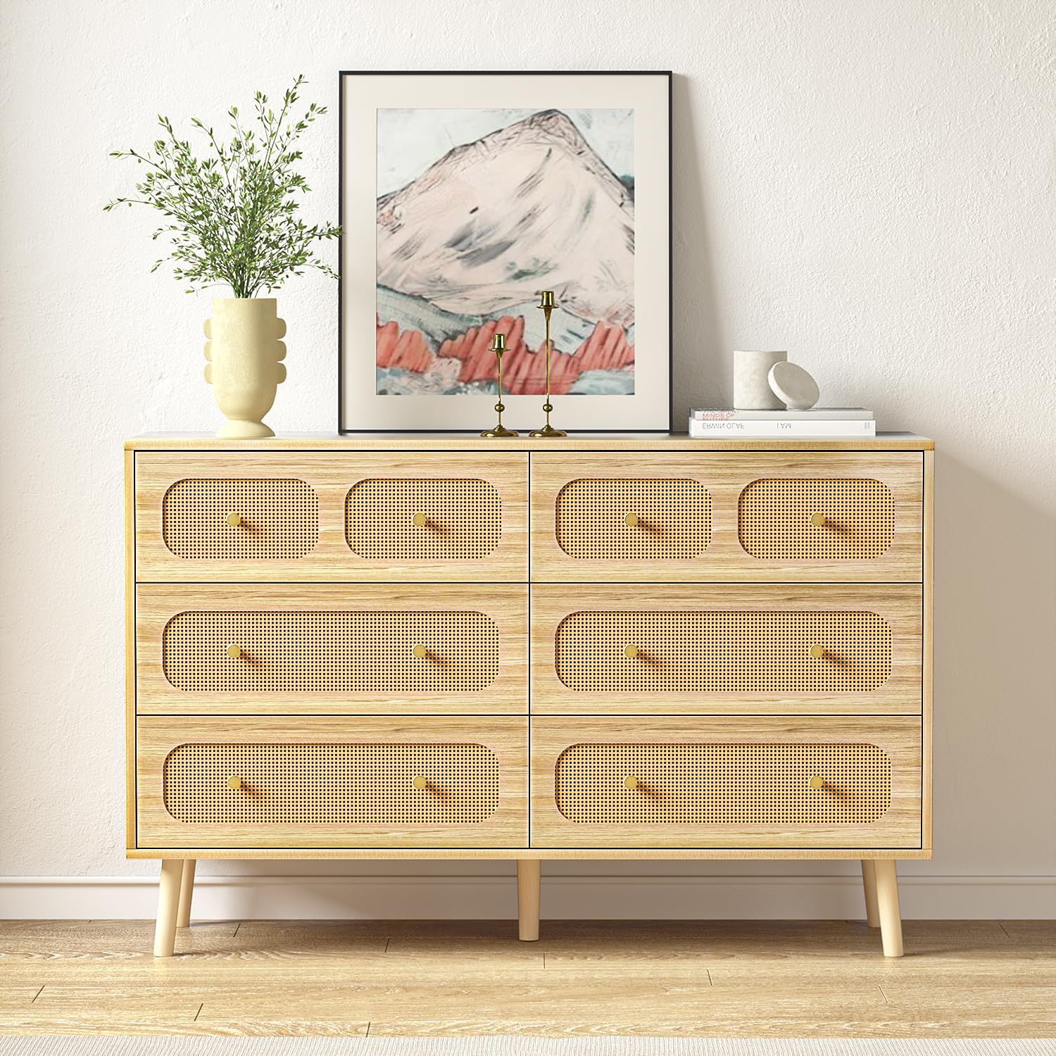 Rattan Dresser for Bedroom, Modern 6 Drawer Double Dresser with Gold Handles