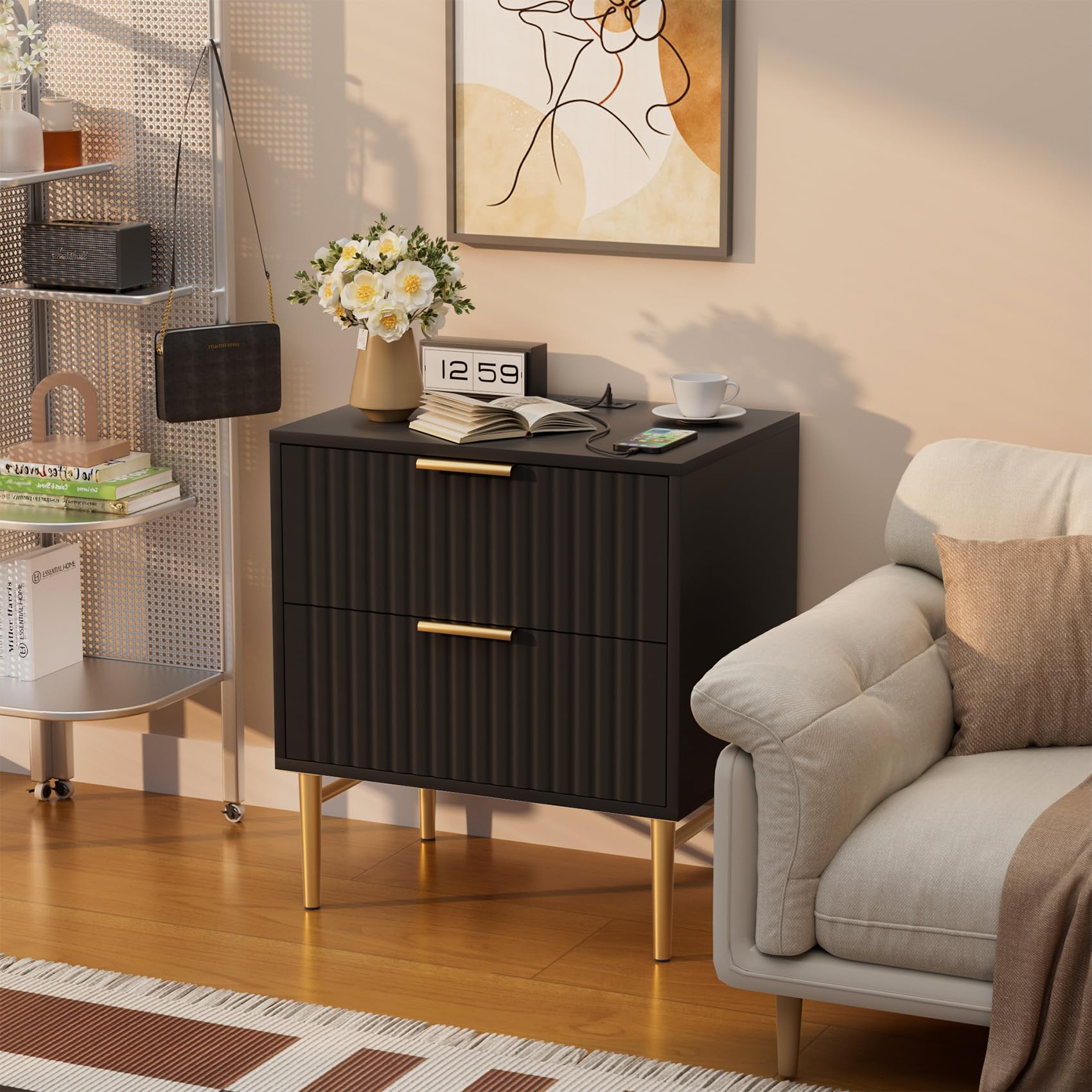- MODERN AND FLUTED NIGHTSTAND -- The black nightstand features a stylish fluted pattern, and designed with clean lines, minimalist design with matte black, and gold frame, which make it a perfect complement to modern interiors. Whether placed in the bedroom or as a side table bedroom or end table in other areas of your home, will effortlessly catch the eyes and elevate the overall aesthetics.