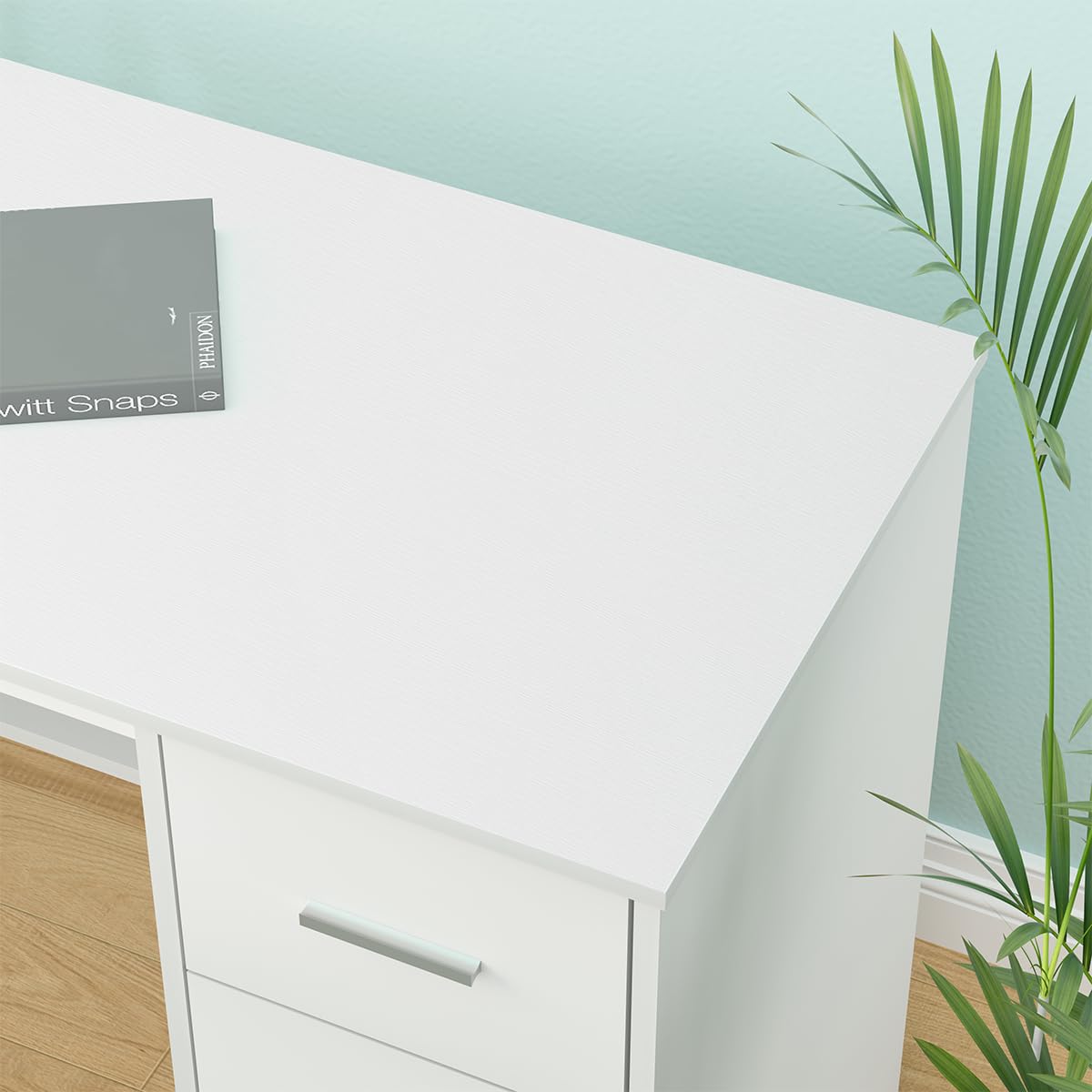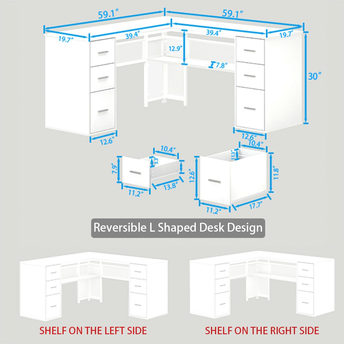 - This white computer desk with drawers features a L shaped structure, allowing the desk to be placed in the corner or against the wall, maximizing the utilization of space. This white L shaped desk is reversible, you can place the storage shelves on the left side or right side. Symmetrical design presents a sense of balance, harmony, and neatness. It’s the perfect addition to your workspace.