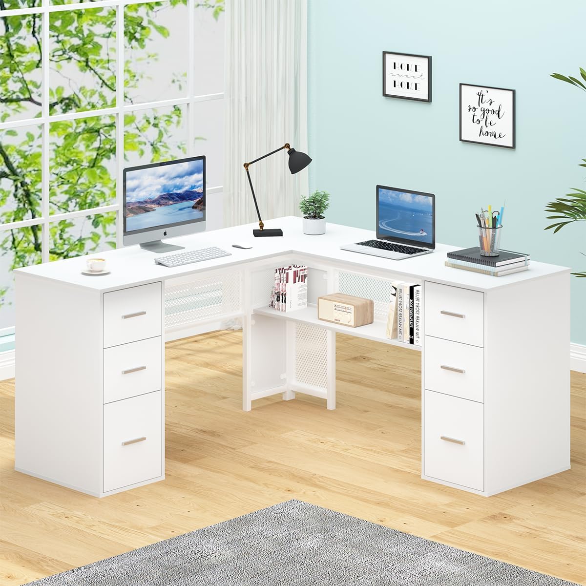 - The open long shelf of the white L desk provides a place for essential office supplies at arm’s reach, while the 6 drawers let you tuck away anything from loose odds and ends to important files. The two big file drawers at the bottom can hold letter /A4/ legal size files. This white L shaped desk with drawers and shelves maximally utilize your home office and provide enough space for storage.