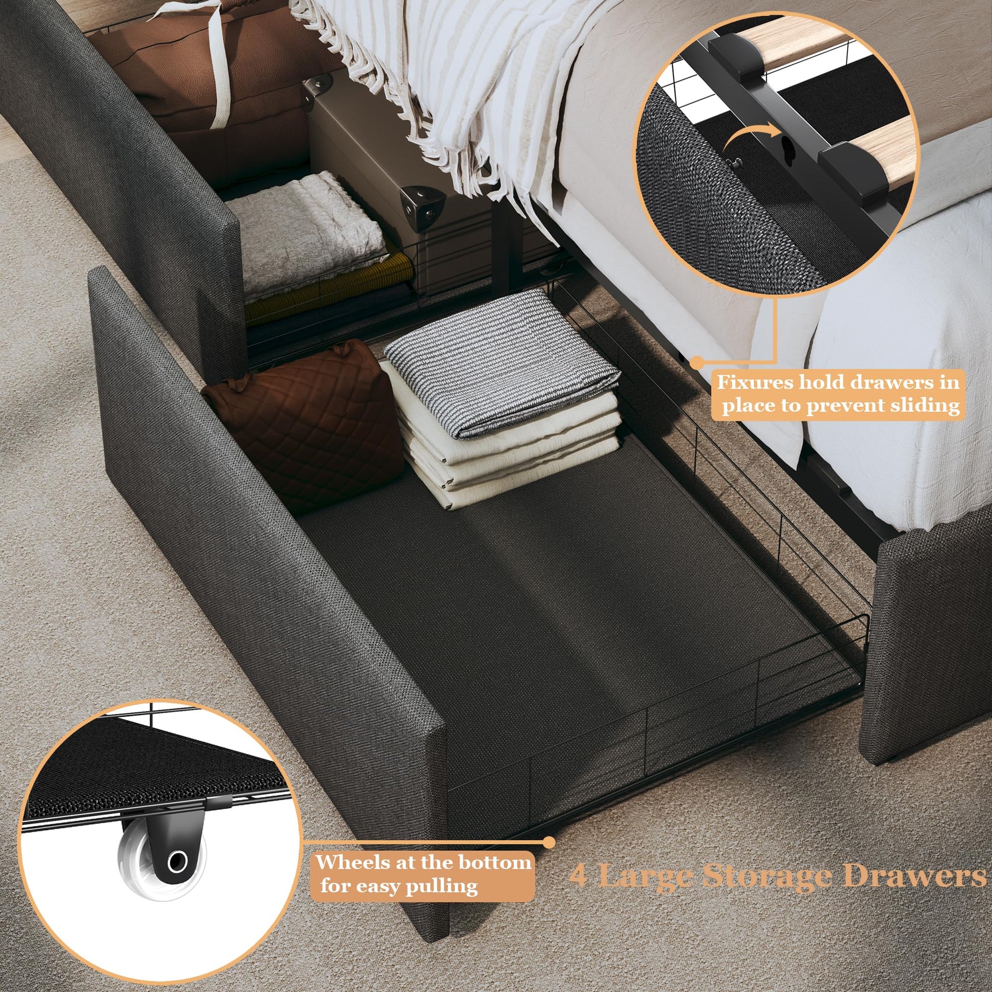 - Bed Frame Queen Size with 4 Storage Drawers: 4 large drawers of queen size bed frame provide perfect storage space for bed sheets and clothing. Matching drawer liners to protect clothing or bedding from getting caught, soiled, or falling through the cracks. The smooth wheels of drawers for freely pulling.