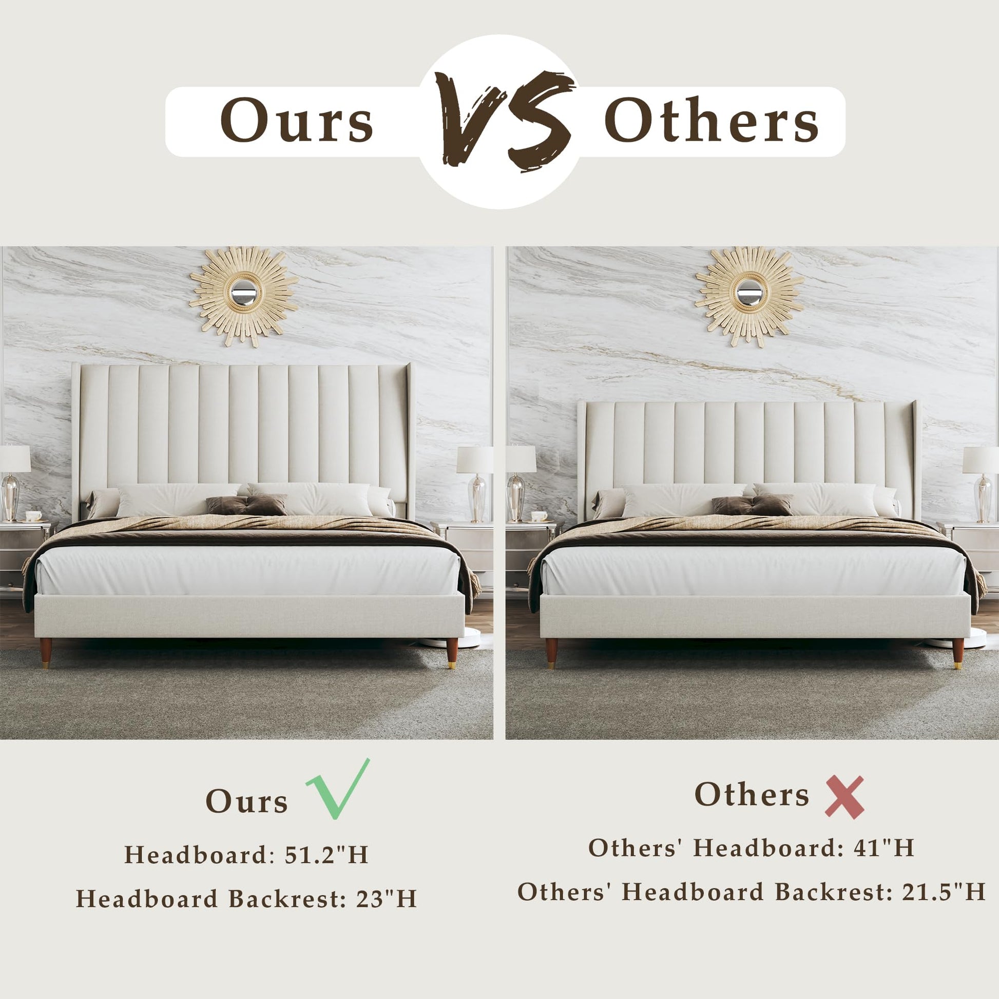 - Upholstered Bed Frame with Tall Headboard: Queen Bed Frame With a 10°tilt design, the 51.2" high headboard provides back support and a headrest. It's undoubtedly soft and cozy, bringing a private sleeping space, more care, and security.
