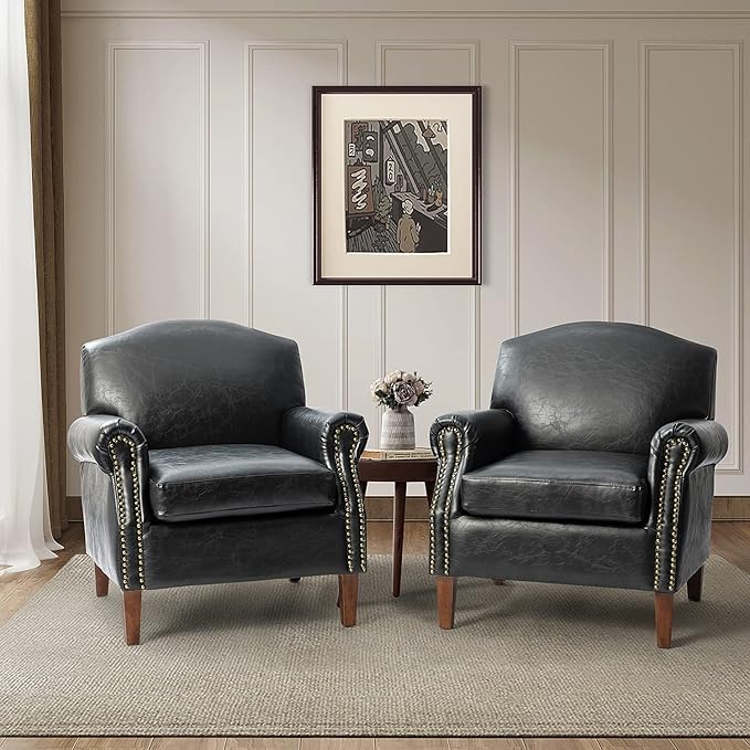Set of 2 Faux Leather Accent Chair with Retro Wood Legs, Comfy Upholstered Armchair
