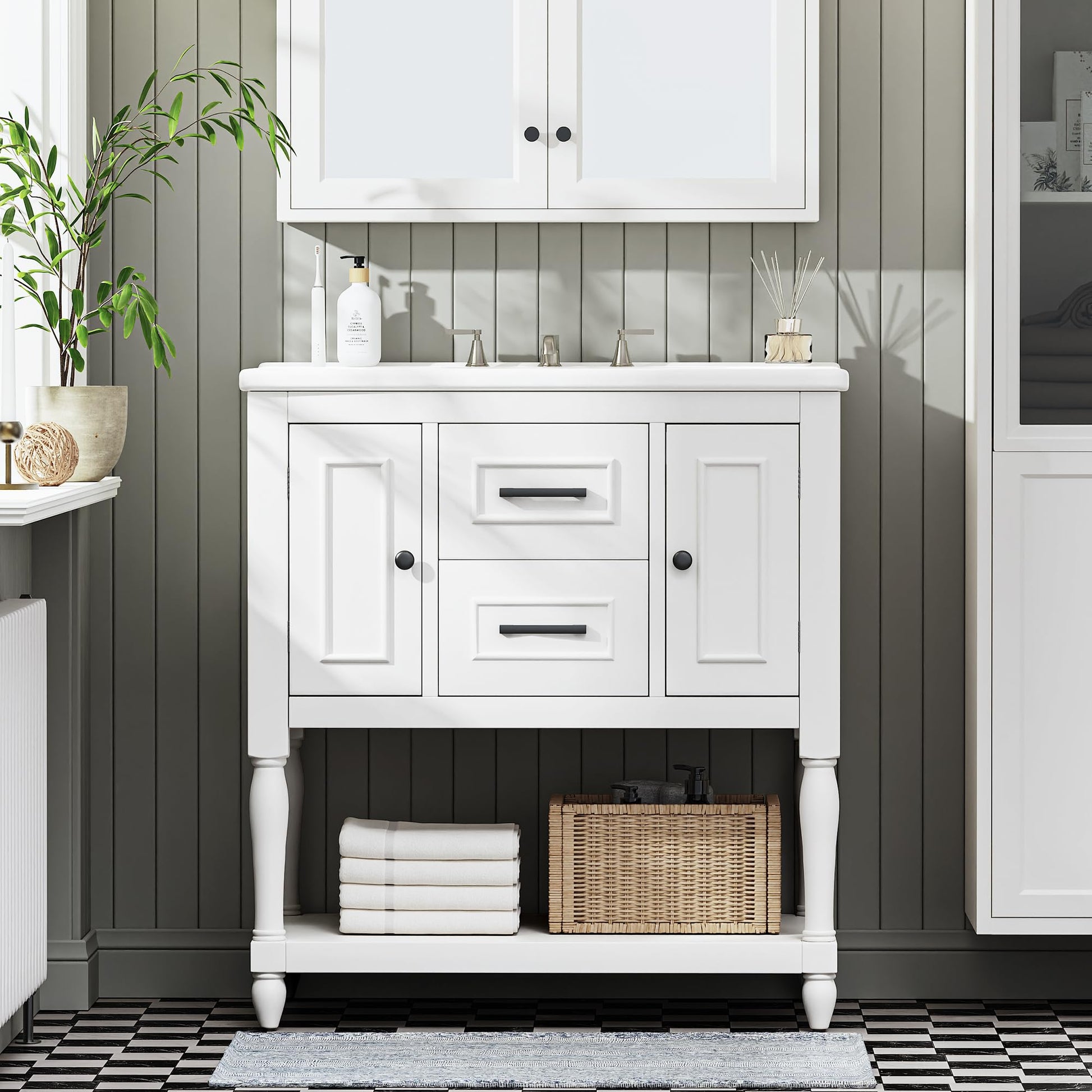 - With 2 closed cabinets, 2 spacious drawers, and a large open shelf, this 30 inch bathroom vanity offers plenty of storage options for all your bathroom essentials. Store towels, toilet paper, soap, and even decorative items like woven baskets or potted plants to create a cozy, organized atmosphere. The open shelf also lets you personalize your space, while the back panel ensures easy pipe installation for added convenience