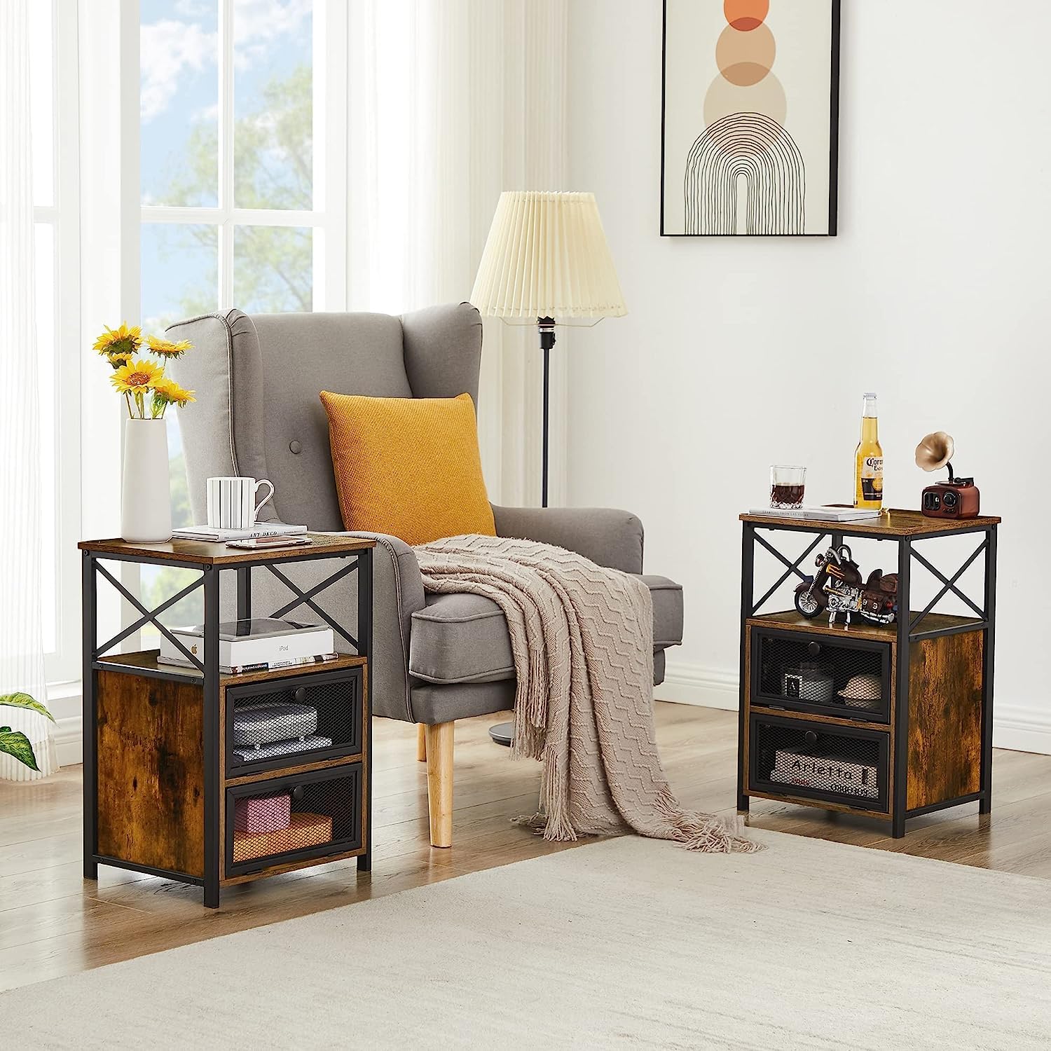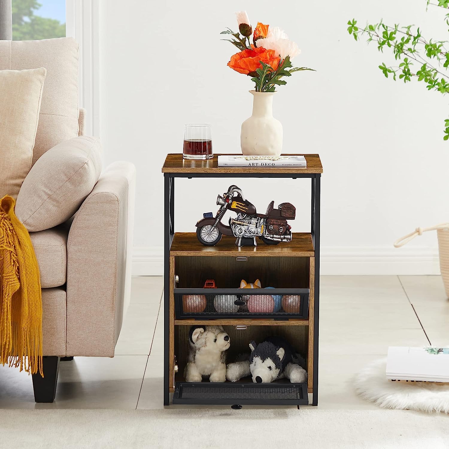 - Large storage with 2 flip drawers and 2 open shelves. Smooth surface and end table drawers for displaying daily necessities. The flip drawers conceal anything you want. It's easy to pull the handle for quiet opening and closing.