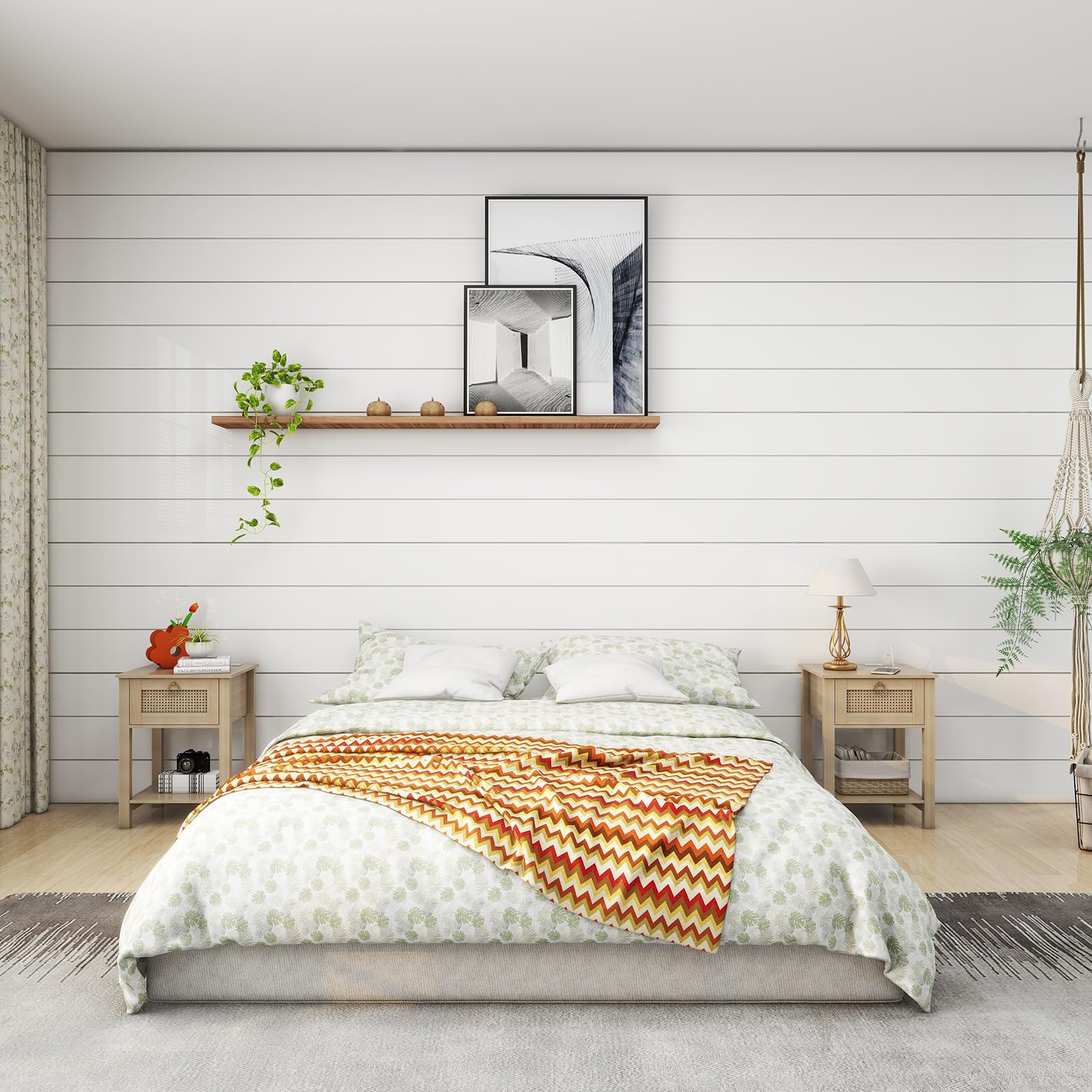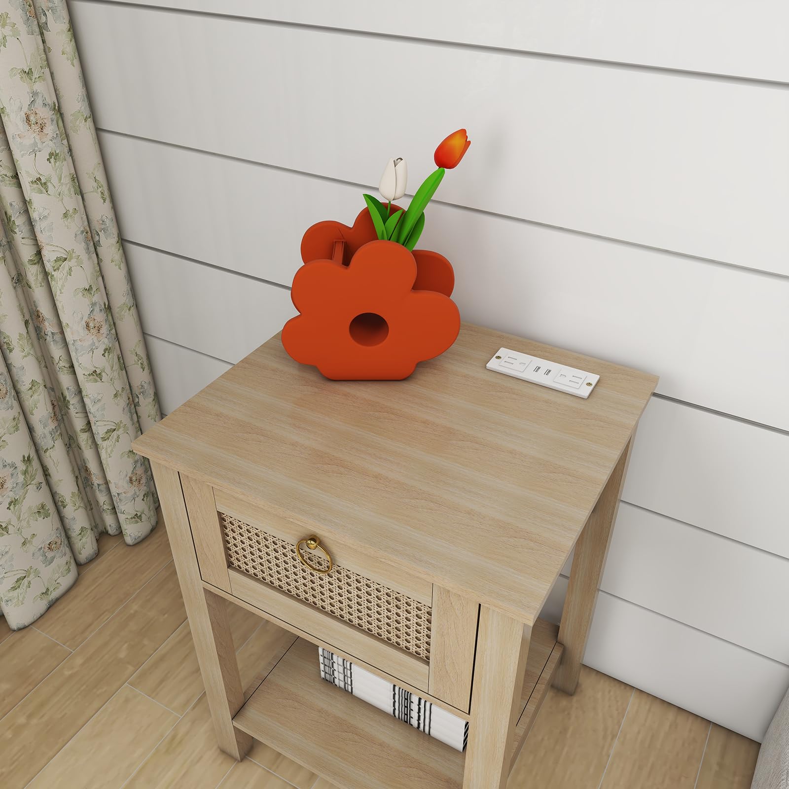 - Farmhouse Nightstand for Modern Homes – This Boho rattan nightstands designed with one drawer and storage open shelf, thickened oak wood boards add rustic style and enhance the stability.