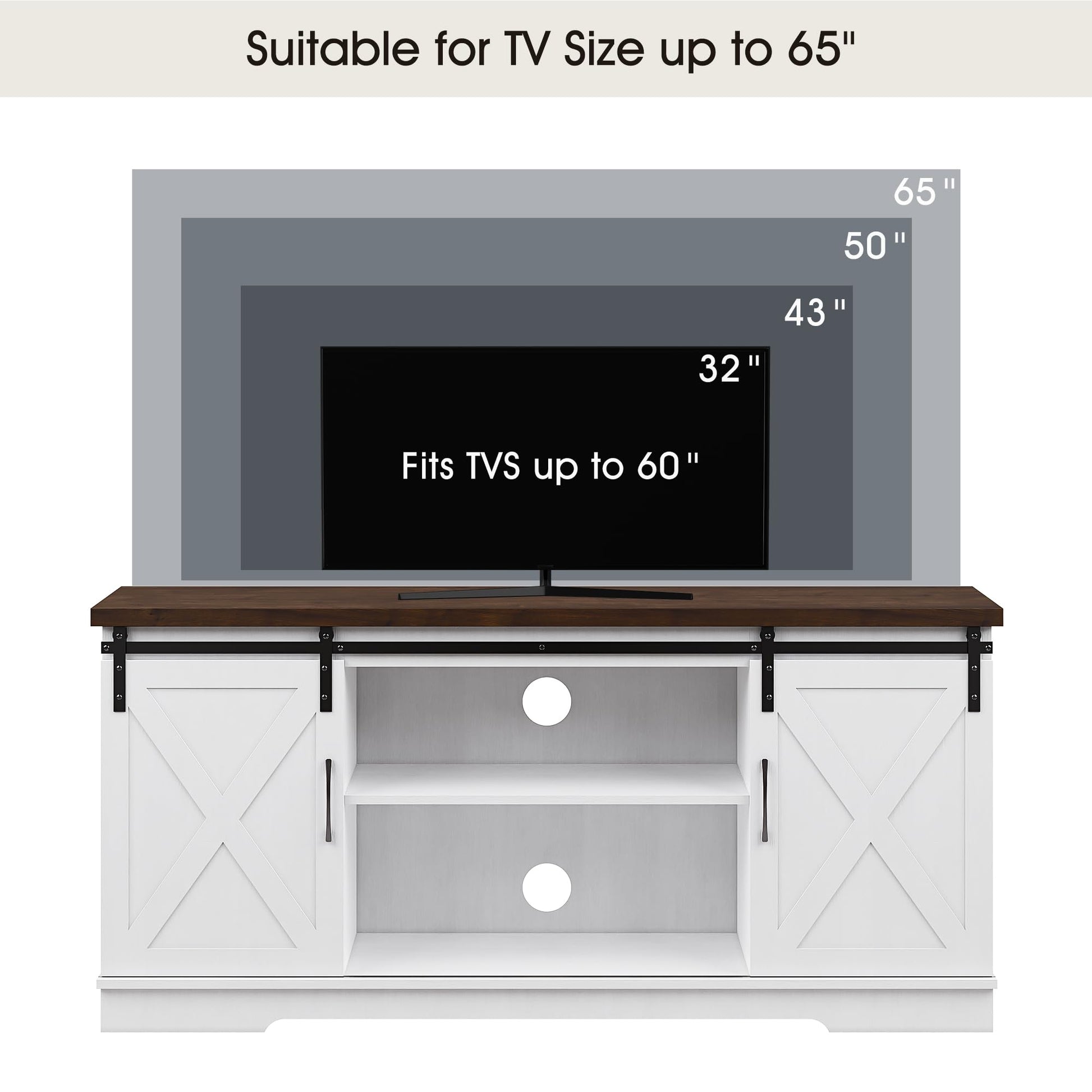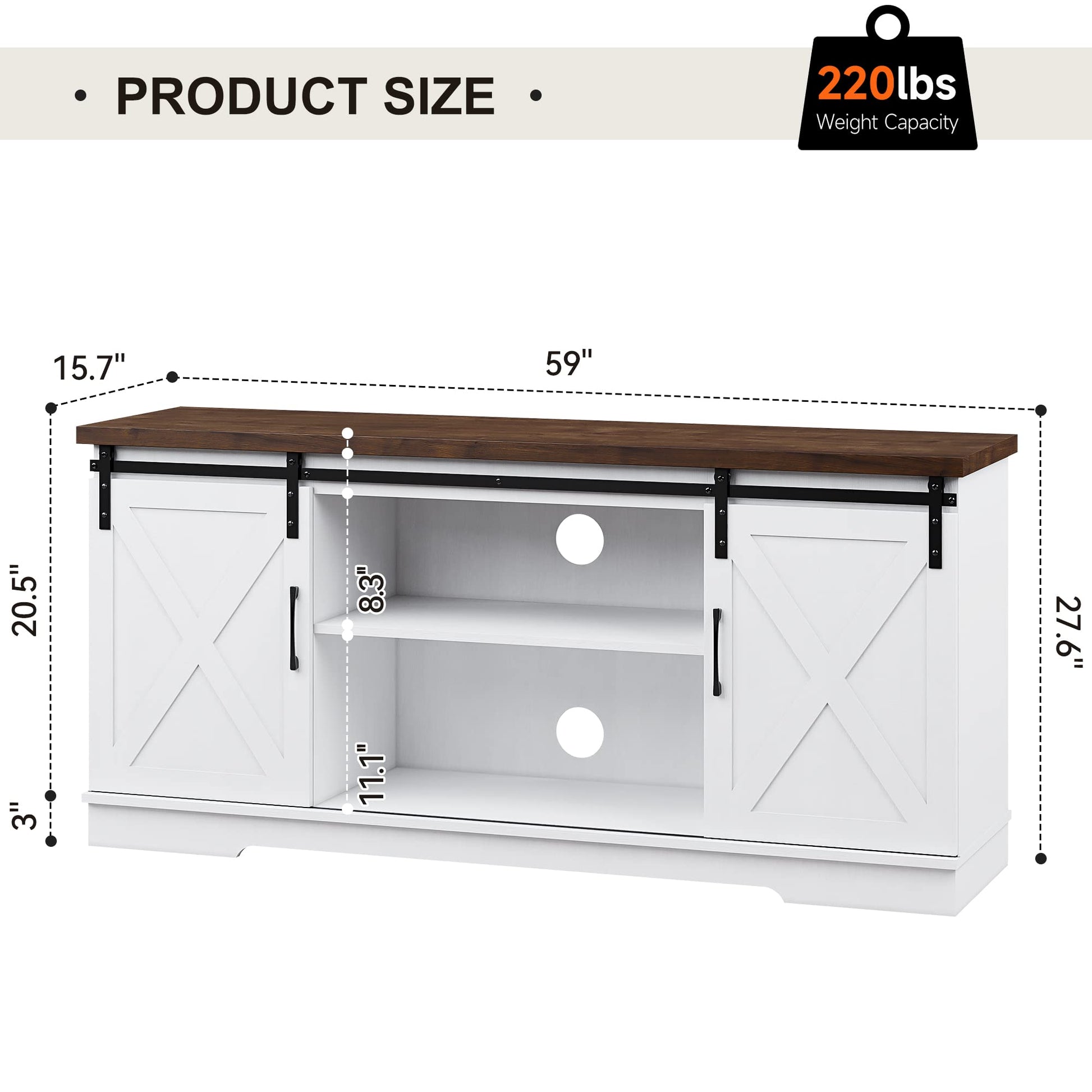 - Farmhouse TV Stand: Combining modern and traditional farmhouse styles, this barn door television stands shows a rustic, stable look that suits all decor styles and increases the beauty of your living room. Overall dimension 59"Lx15.7"Wx27.6"H. This TV entertainment center fits 40/55/65inch TVs, suitable for most home TV placements.