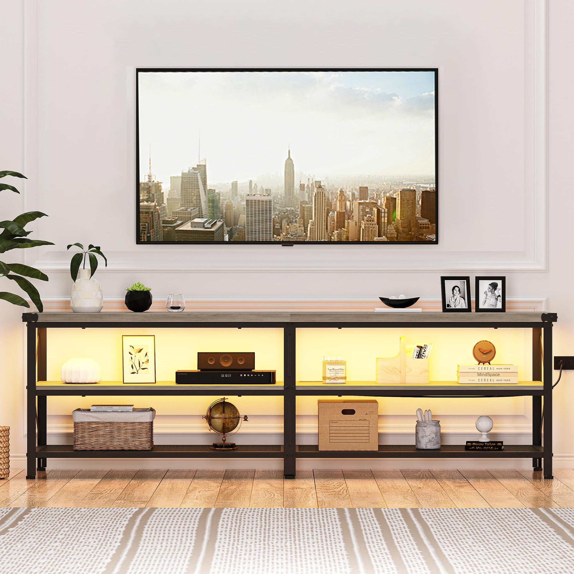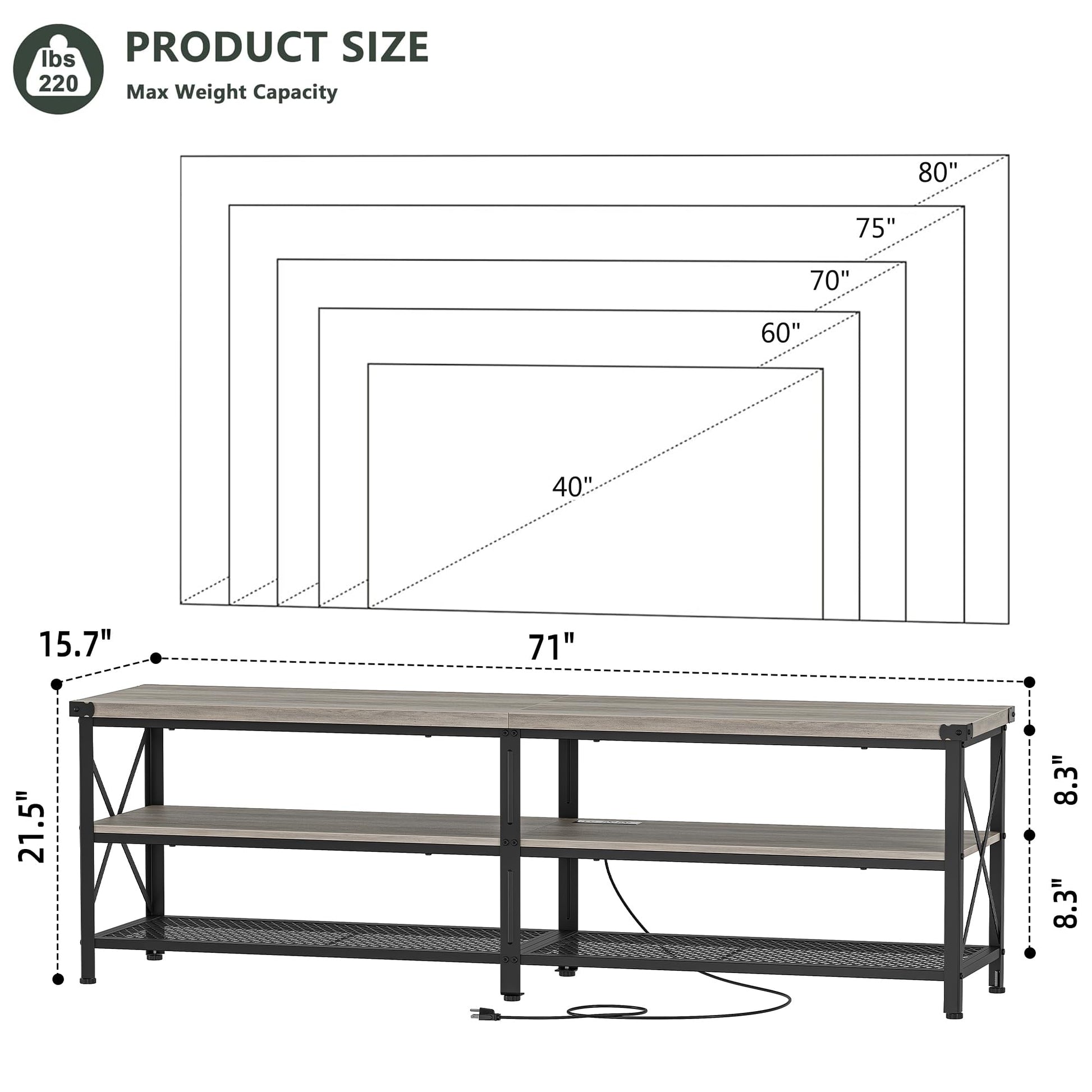- PRODUCT DIMENSIONS: The industrial TV stand overall size is 71” L x 15.7” W x 21.5” H. It is suitable for flat screens and curved TVs up to 80 inches. The clean-lined scientific, rational layout and built-in 2 USB ports and 2 standard plug outlets ensure sufficient storage space and meet the needs of different equipment. The TV stand gives you ample storage space for media players, game consoles, tv components, and any other home decor art to keep your living room clean and away from sundries.