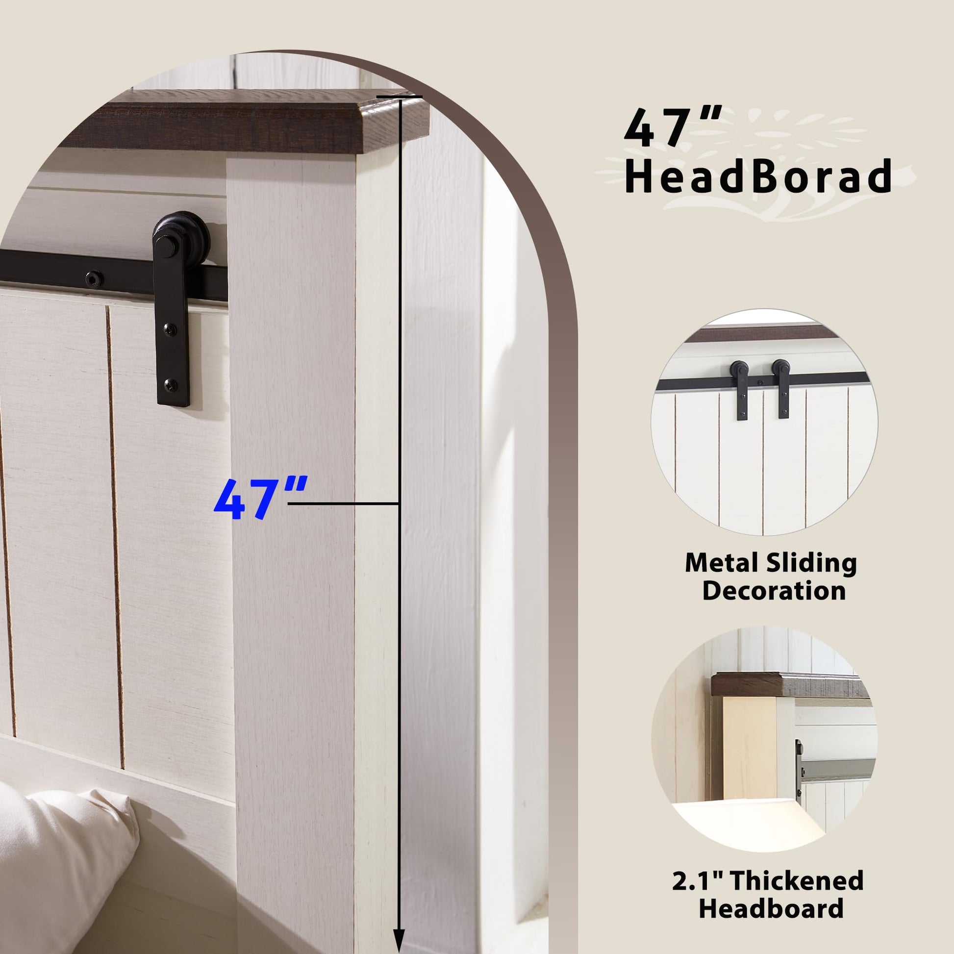 IFGET Farmhouse King Size Bed Frame with 47" Headboard, Wood Bed Frame with Groove Sliding Barn Door Footboard, Platform Bed with Wood Slats Support, No Box Spring Needed (White)