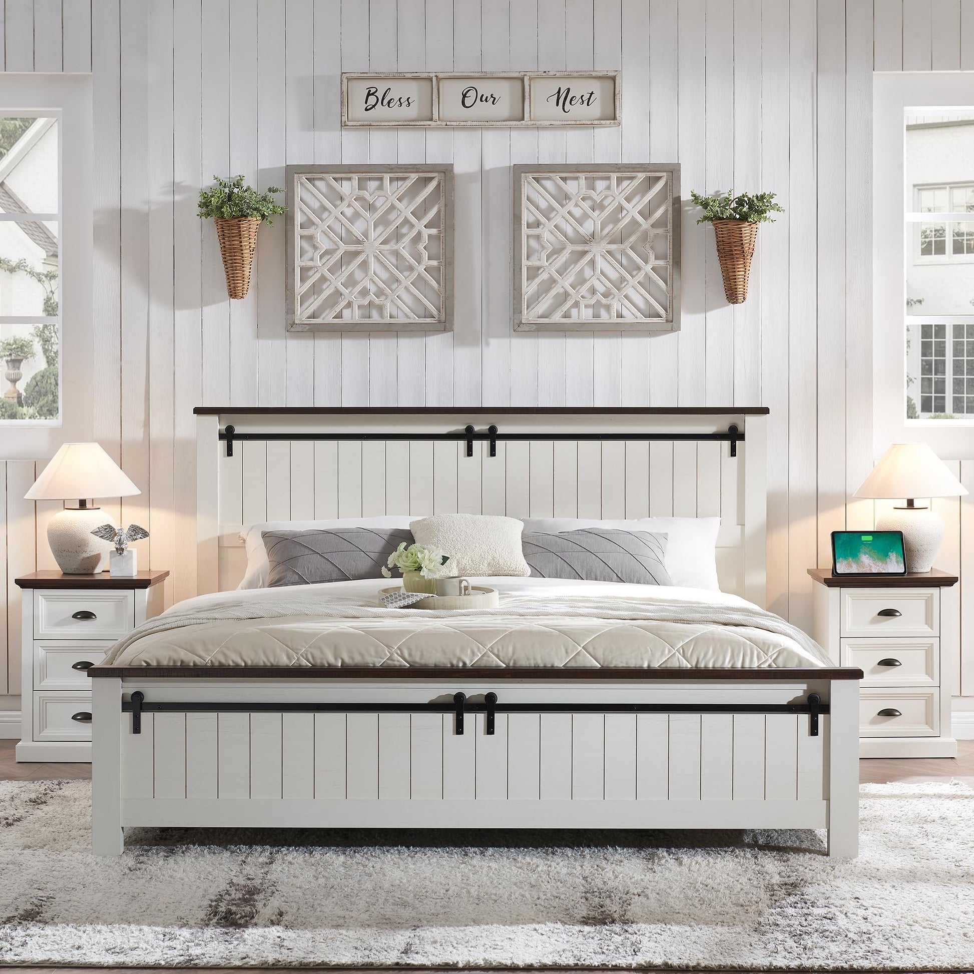 - 【Farmhouse King Size Bed Frame】Elevate your bedroom with our exquisite Farmhouse King Size Bed Frame, featuring grooves and sliding barn door-inspired headboard and footboard. Accented with sleek black metal hardware, it adds texture and clean lines to your space, seamlessly blending modern and rustic charm. Pair it perfectly with other pieces from the IFGET Bedroom Furniture Collection.