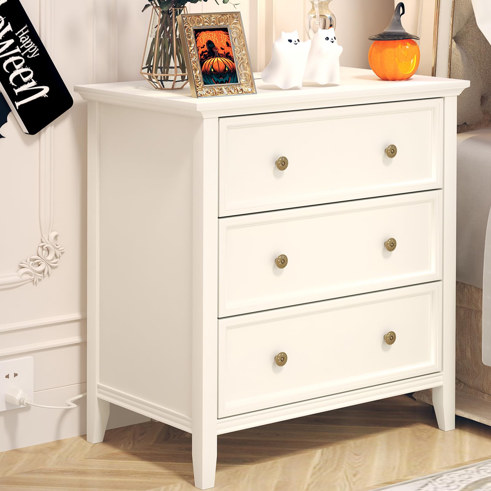 White Nightstand with 3 Drawers and Charging Station, Solid Wood Nightstand