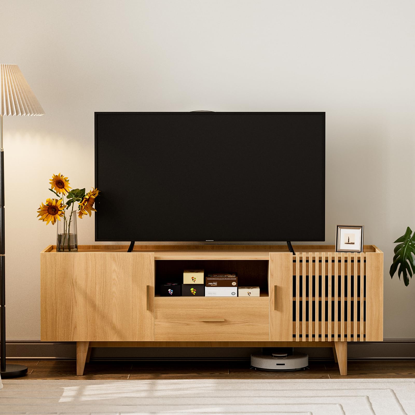 - Large Storage The TV Stand with Drawer and 2 Cabinet Doors with shelves, can be used to store your daily needs. In additionally, 1 open niche for storing game consoles, media, magazines, DVDs, remotes, and decorative items.