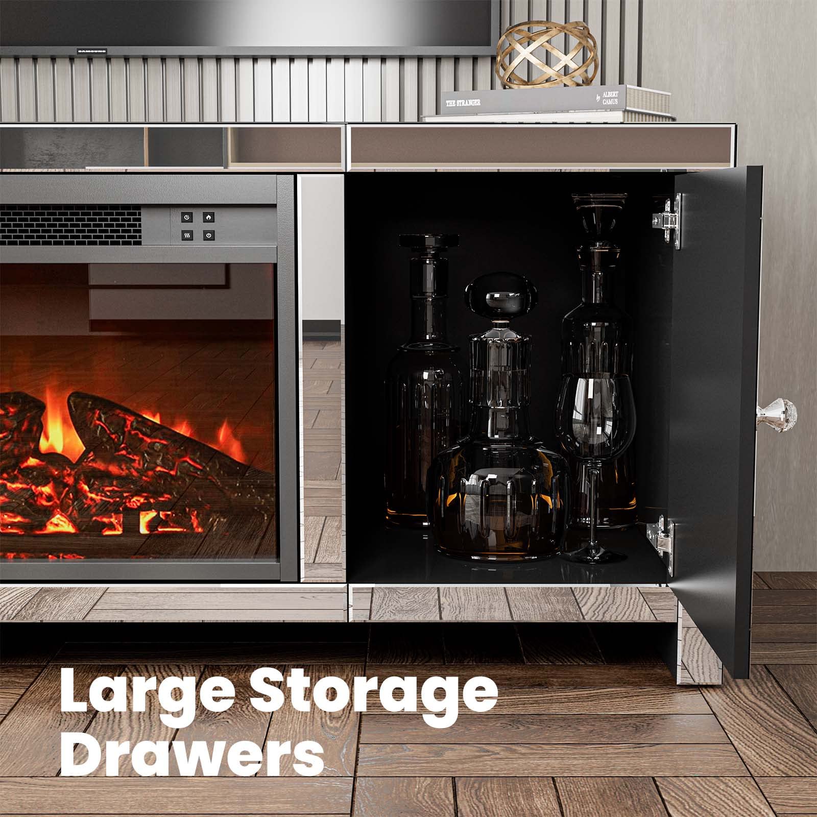 - The mirrored Fireplace TV Stand adopts high-Quality MDF board and smooth glass mirrored finish. A drawer with diamond handles for storage needs. Smooth surface of this Tv stand makes your cleaning more easier. The stains left on the tv stand can be quickly wiped, which also reduces your annoyance accordingly.