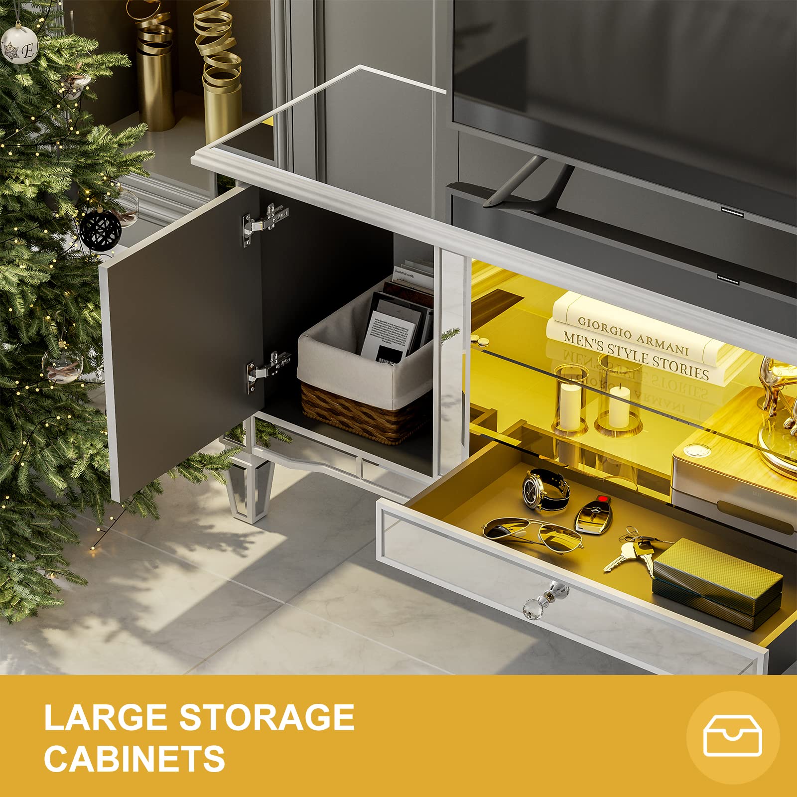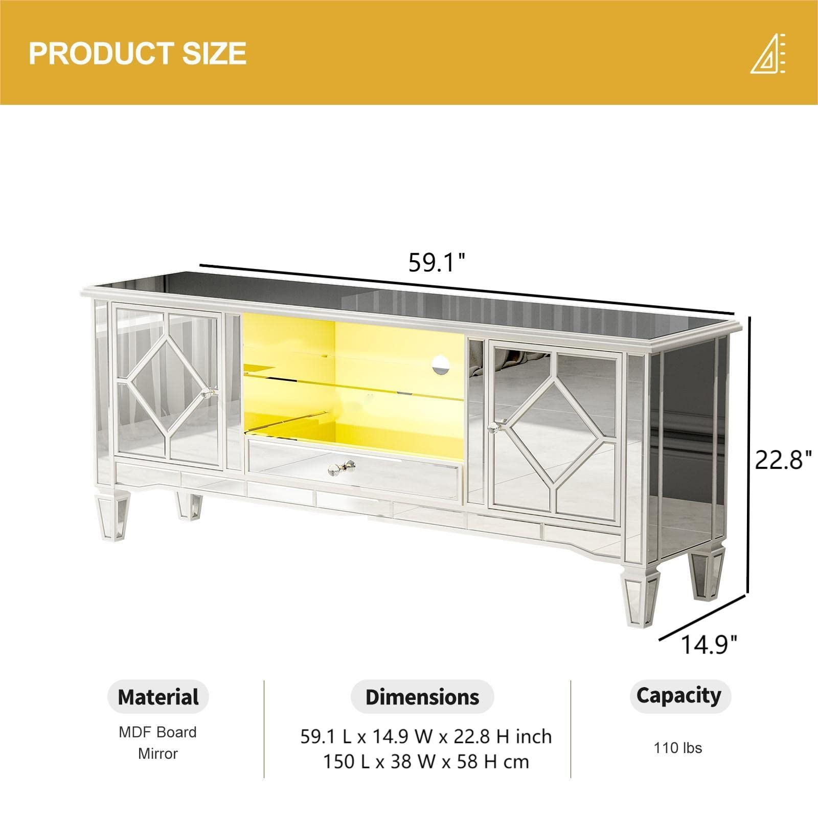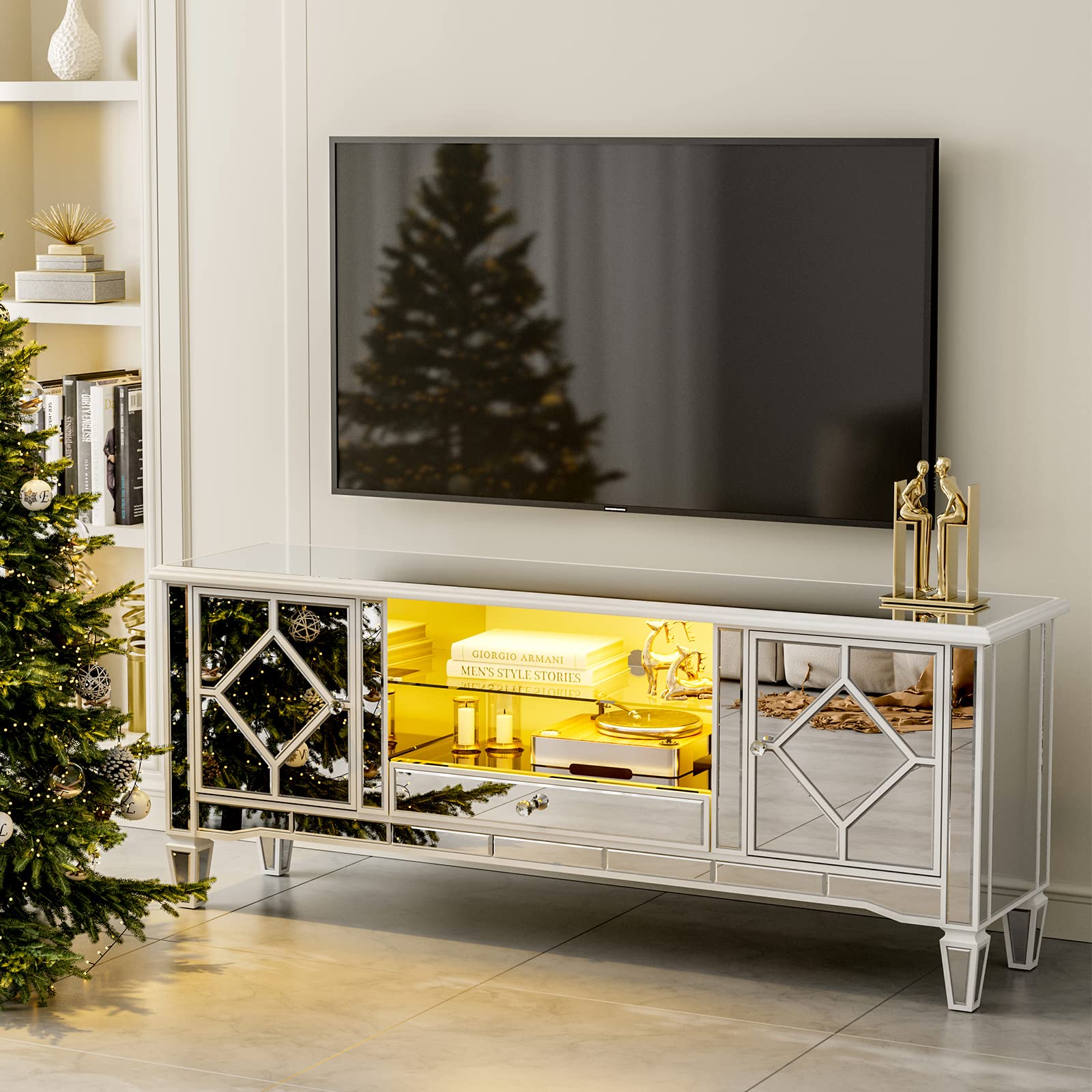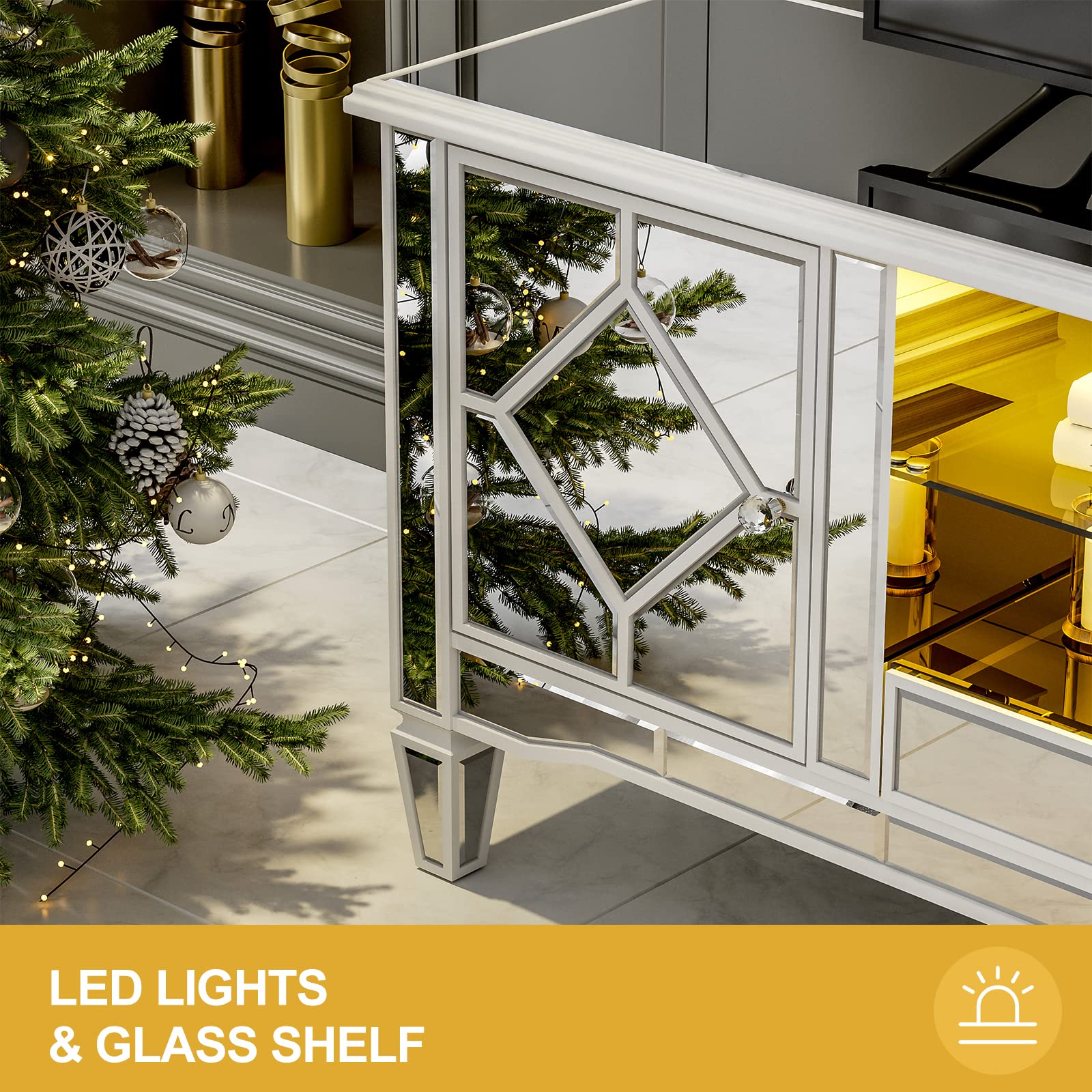 Mirrored LED TV Stand for 65+ inch TV, Silver Entertainment Center with LED Lights