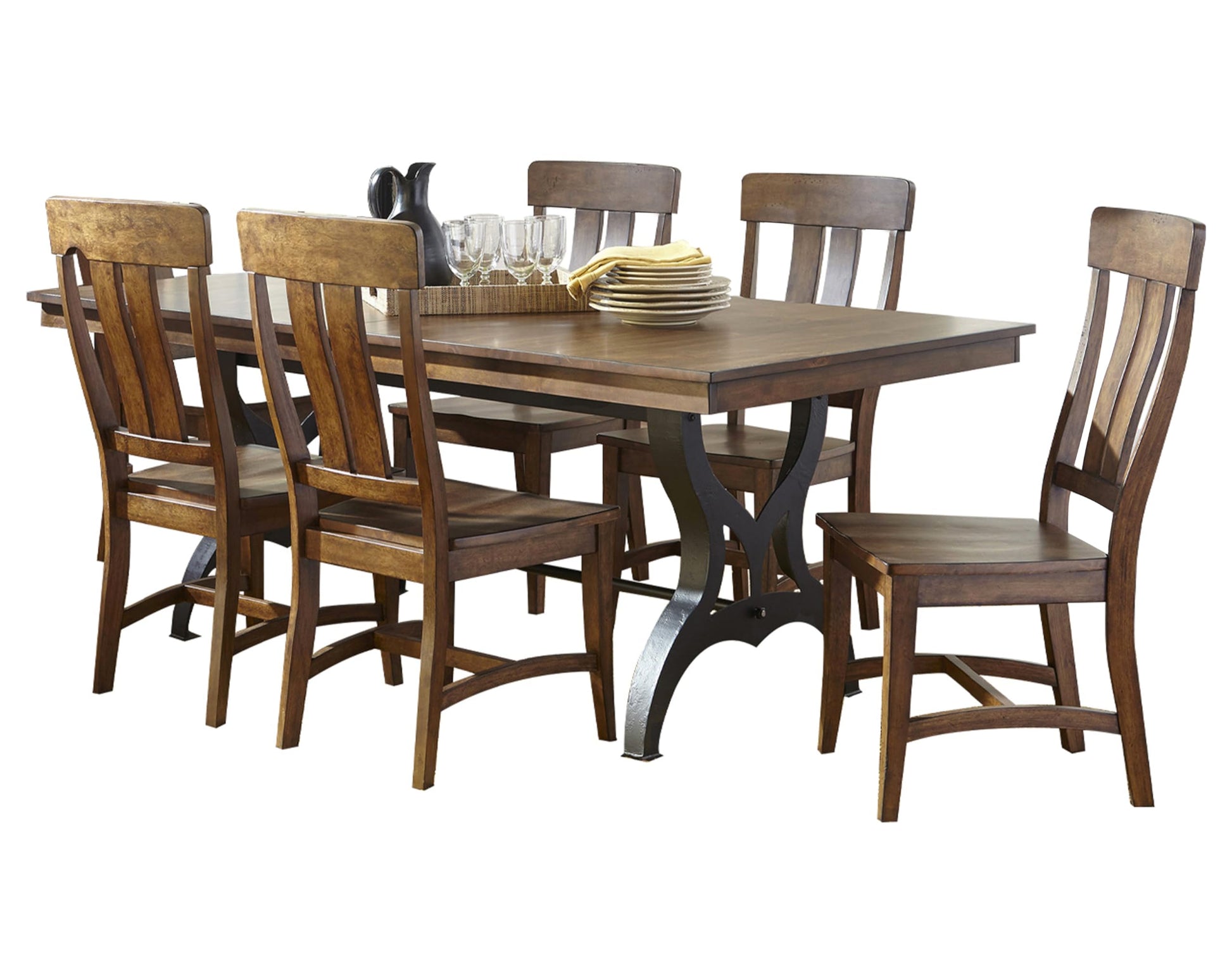 - Solid knotty birch trestle table top adds rustic flair to any space