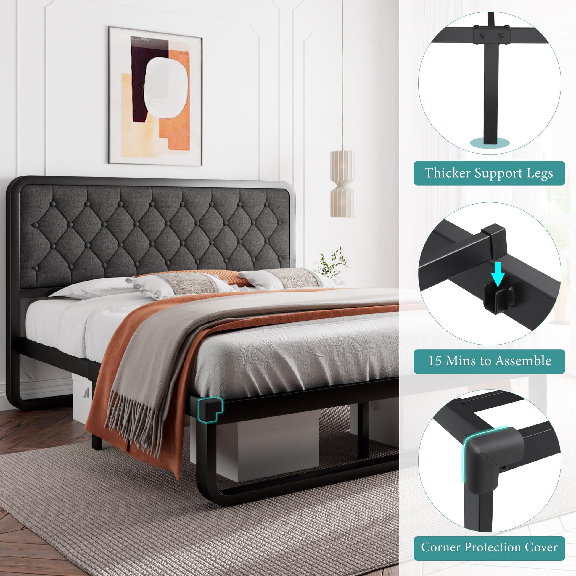 Special Feature | Linen upholstered headboard, Durable, Hardended Steel Tubes |