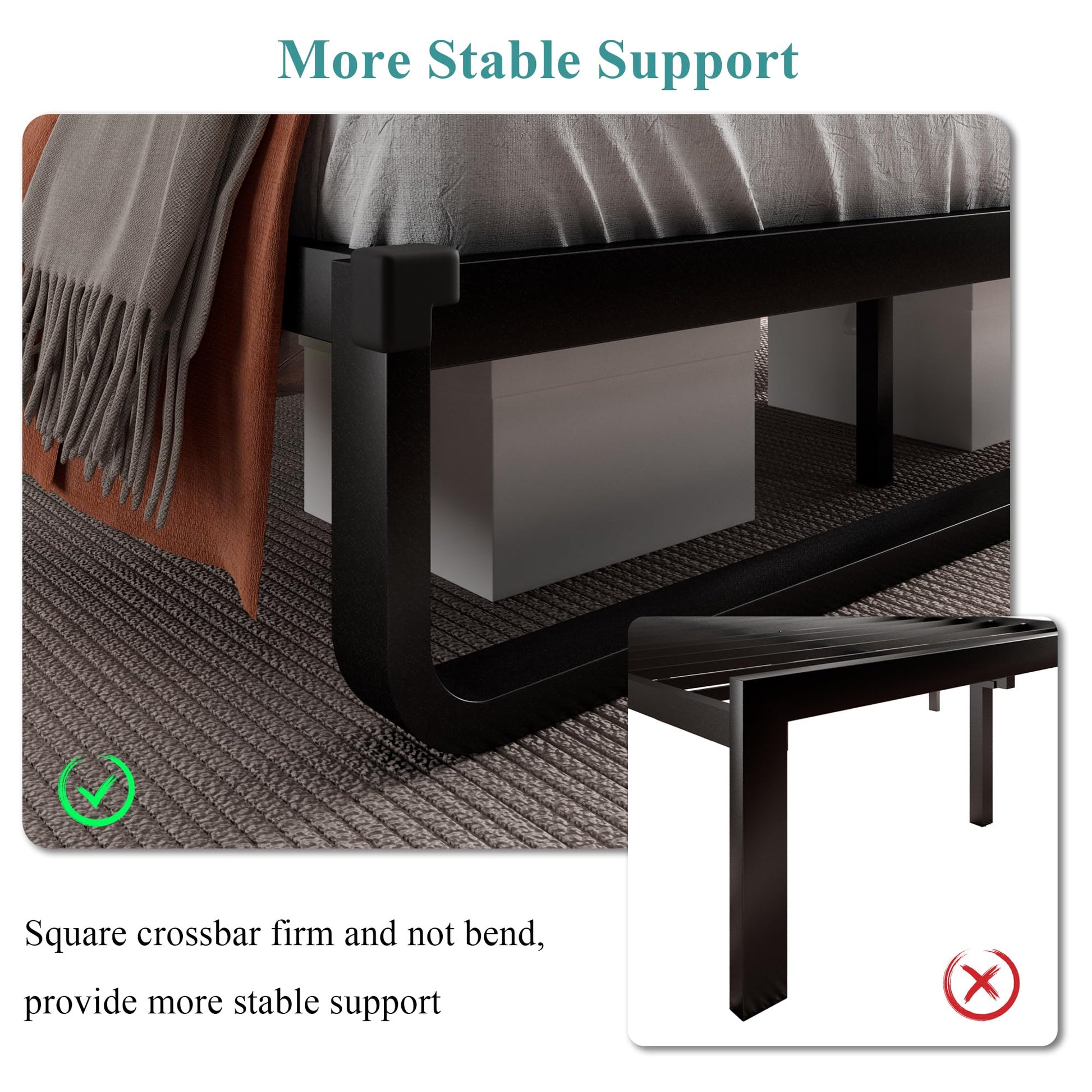 - No Creaks & No Noise: EVA material on the metal base holds the slats in place and the mute buckle reduces friction between the slats and frame, really stable and not noisy or squeaky at all. (No box spring needed)