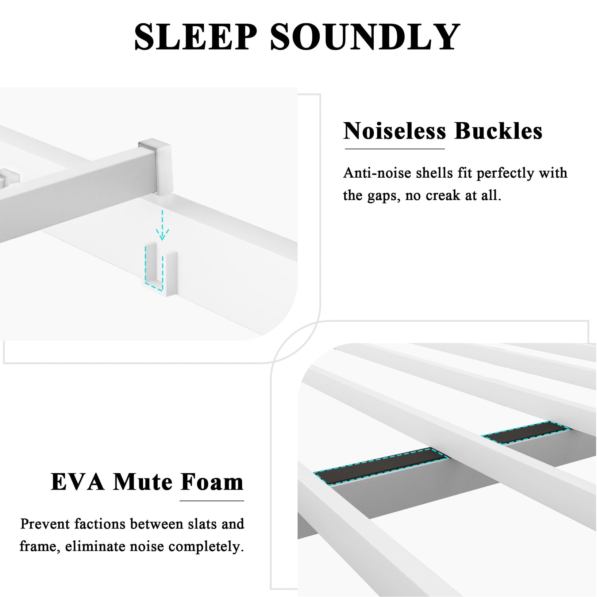- Keep Quiet Overnight: Anti-noise shells help the metal plate fit perfectly with the bed frame and EVA mute foam prevents friction between slats and frame for eliminating the noise. Provide you and your family with a comfortable sleep night