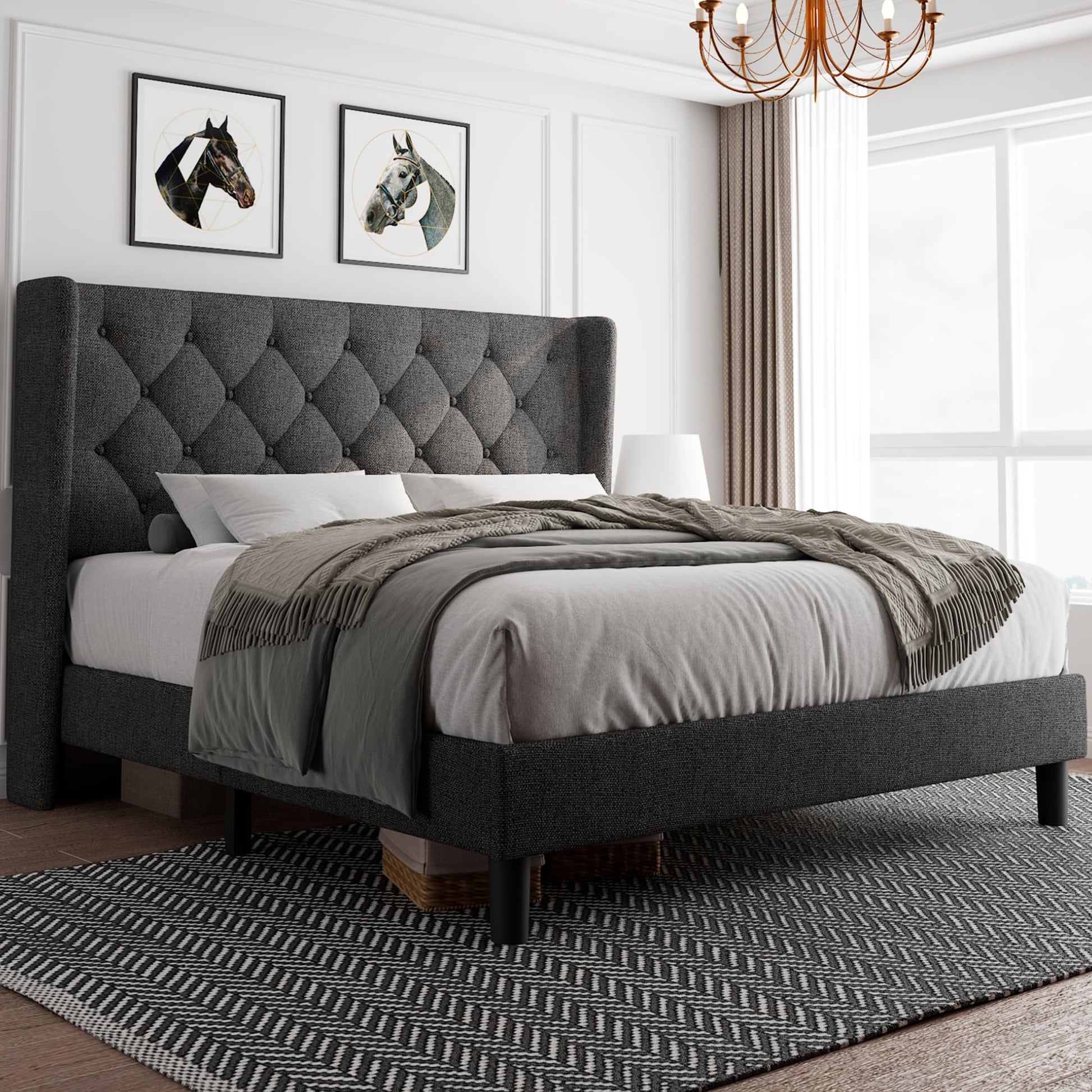 - Upholstered Bed Frame: This wingback bed frame features a soft and comfortable button tufted headboard that you can easily lean against. The winged sides not only secure your pillows but also provide a convenient shelf on top, perfect for placing glasses and phones, making it both practical and functional