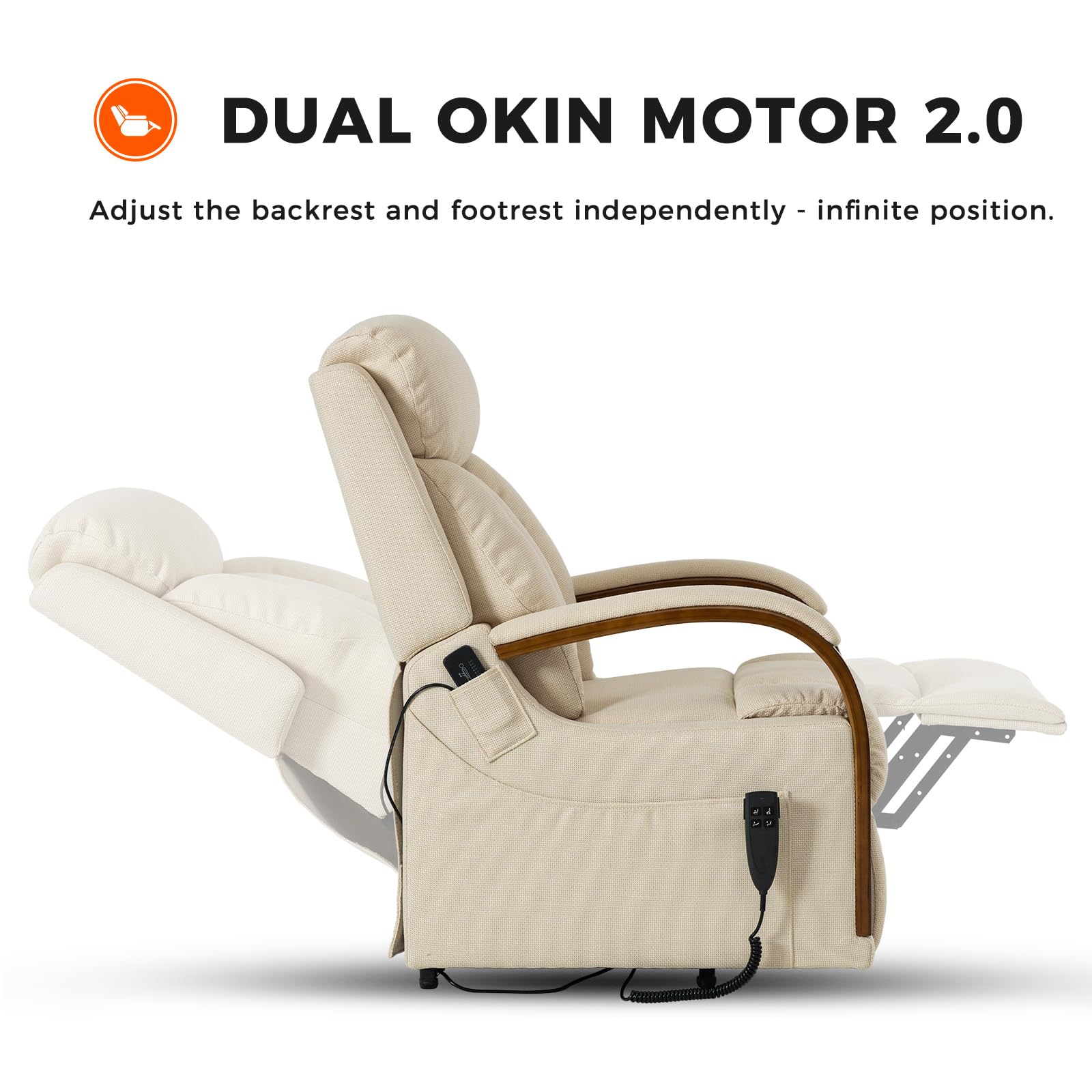 - INFINITE POSITION & DUAL MOTOR This lift chair is specially powered by German OKIN dual motor - each motor works independently. You can get any position you want easily as the backrest and footrest can be adjusted individually. The recliner offers stand-up assistance, and it's ideal for seniors with difficulty standing from a sitting position.