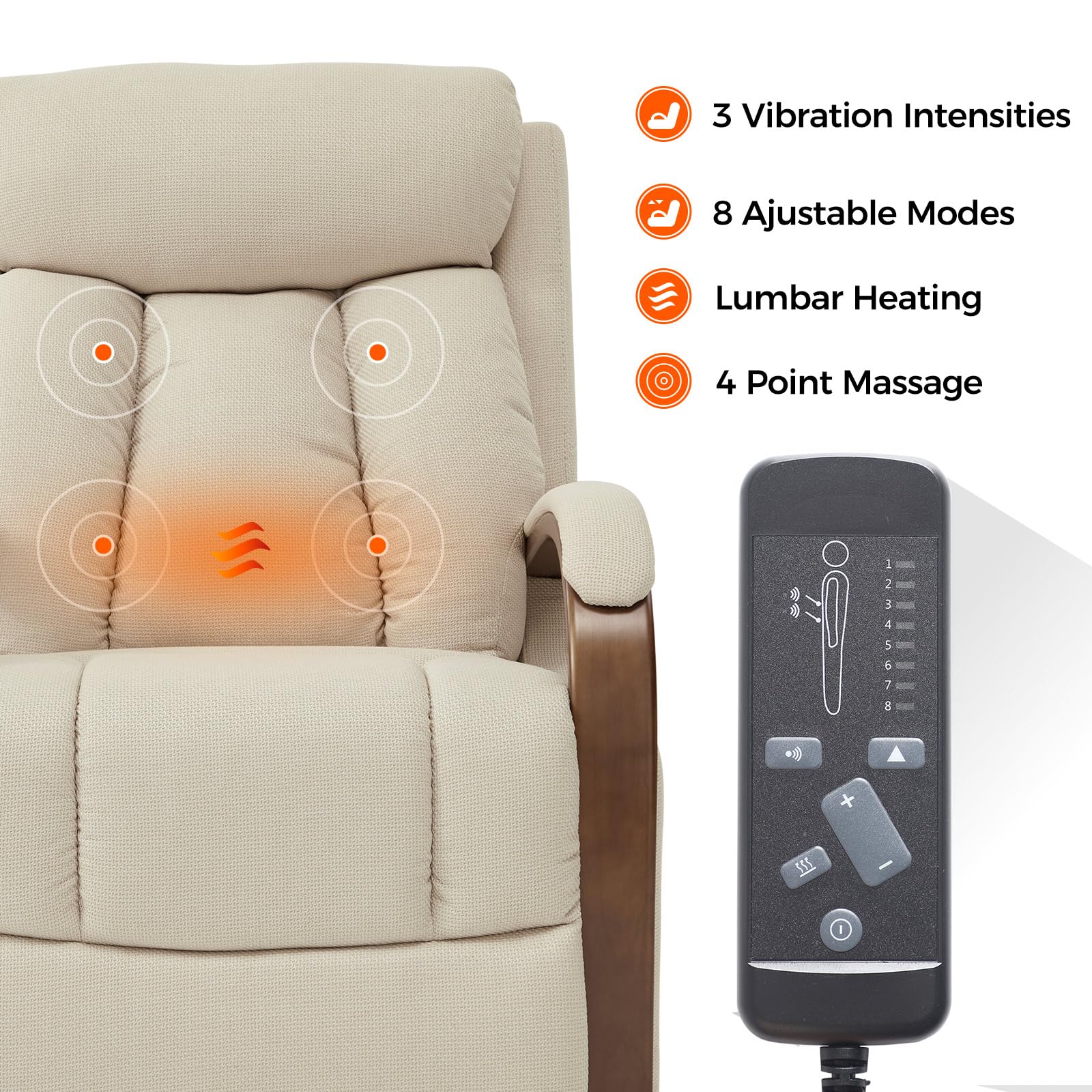 - HUMANISTIC DESIGN WITH HEAT & MASSAGE The stand-up recliner chair is designed with 4 vibrating massage nodes for the back and lumbar, and a heating system for the lumbar. All the features can be controlled by the remote controller.