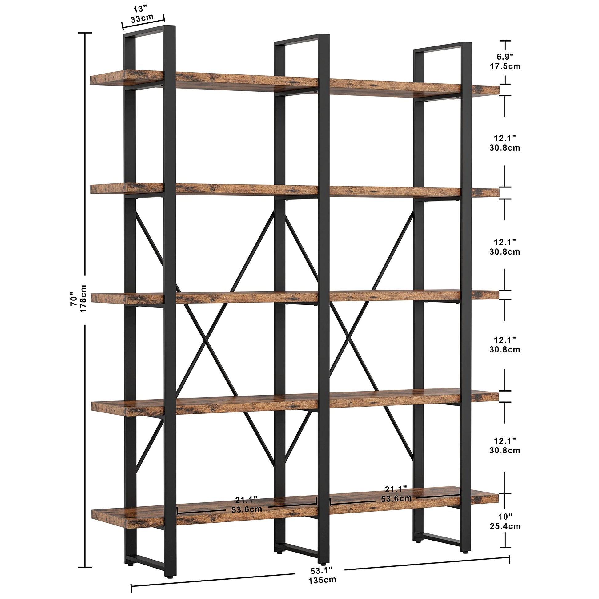 Room Type Office, Bedroom, Living Room, Library, Study Room Number of Shelves 5 Special Feature Durable, Waterproof, Scratch Resistant Product Dimensions 13"D x 53.1"W x 70"H Style Industrial Age Range (Description) Adult Finish Type black Product Care Instructions Wipe with Dry Cloth Size Double 5-Shelf