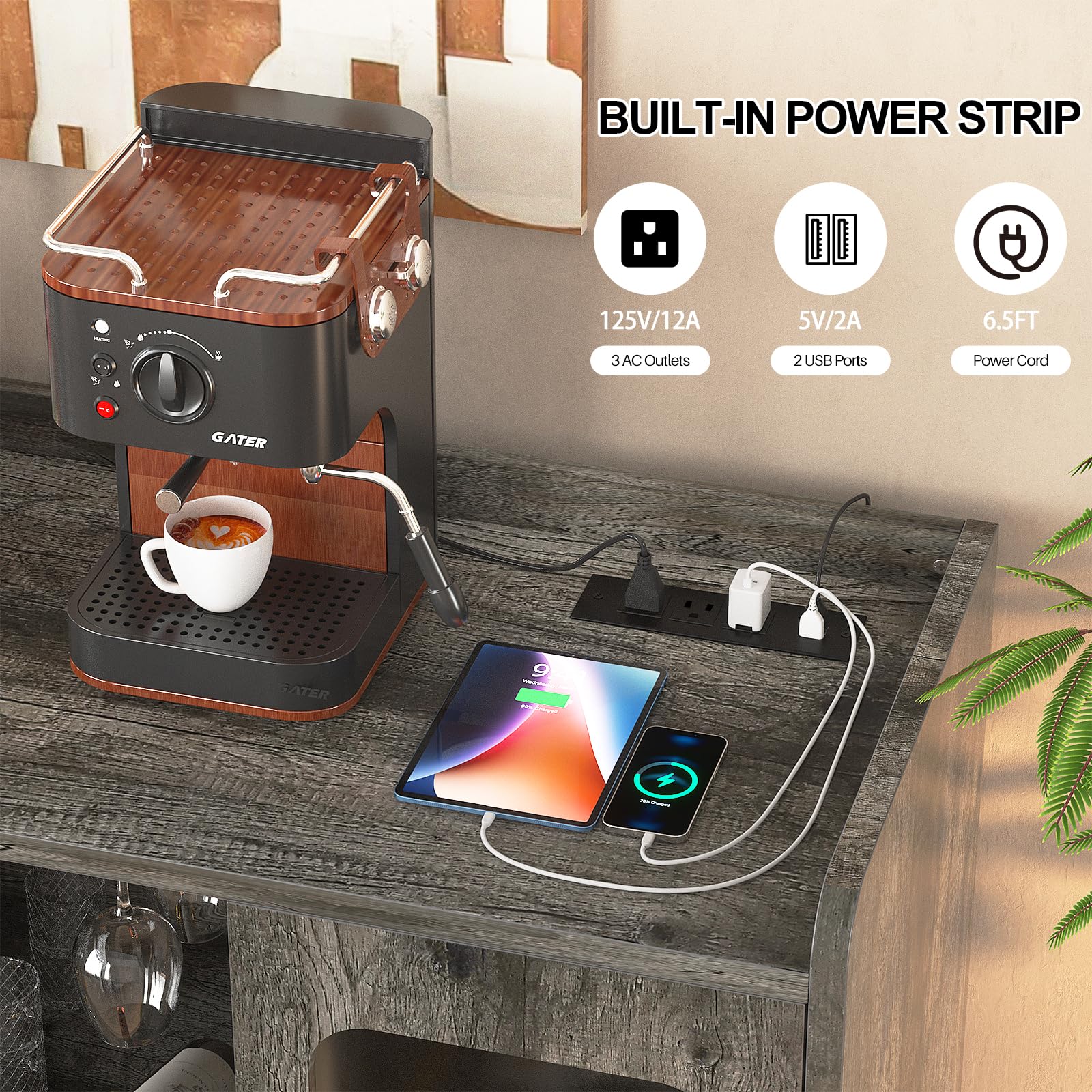 - This bar cabinet is equipped with a built-in power strip with 3 Power outlets and 2 USB charging ports, which can keeps your coffee maker, bar accessories, glowing decorations and other devices charged more conveniently.