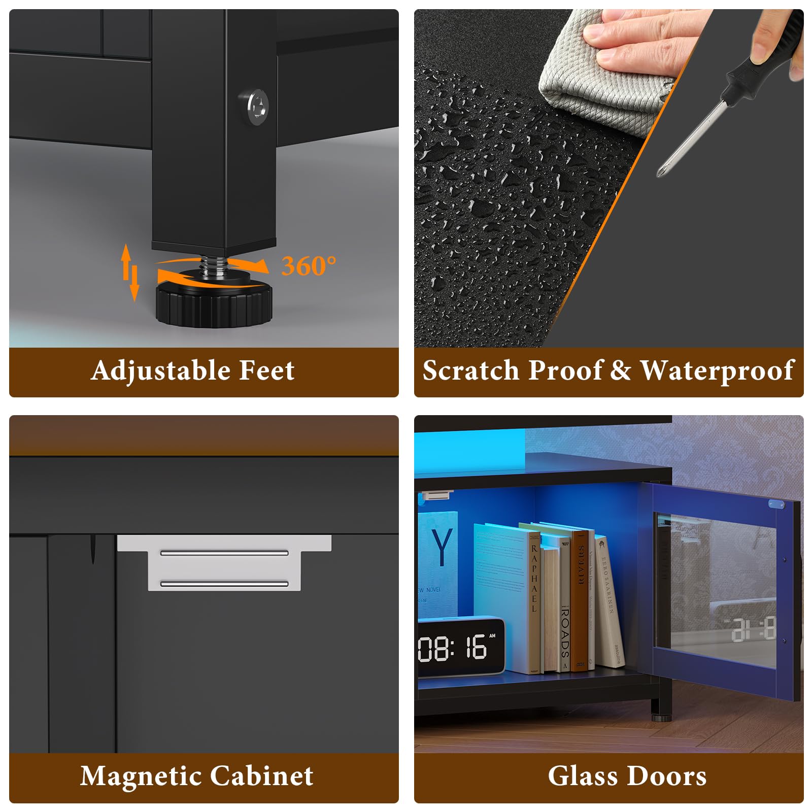 - RGB LED TV Stand This TV stand comes with 2 RGB LED light strips, a built-in sensitivity adjustable microphone, and has multiple lighting effects (multi-color gradient, single color cycle, static color). You can control it remotely using the mobile APP while lying on the comfortable sofa, and customize your space and atmosphere according to your mood.