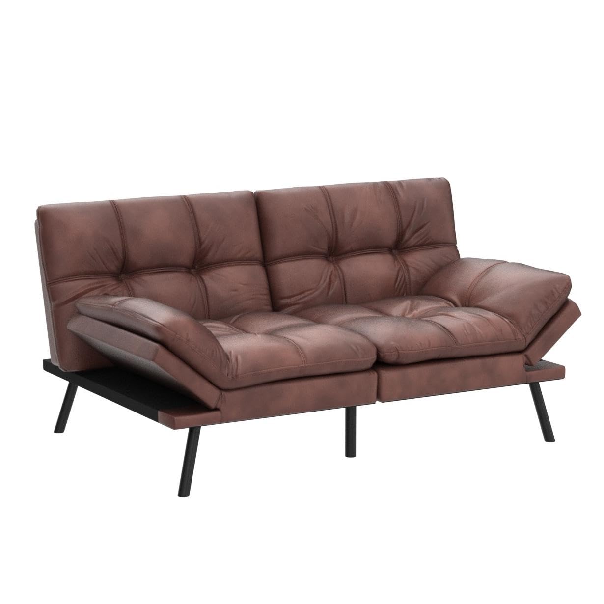 - Durably crafted with tufted faux leather and 6 chrome metal legs, easy to clean and maintain, with a beautiful color and textures of leather, this convertible futon sofa bed fuses comfort and style that will last in your living space for years to come. The comfortable foam cushions make a perfect addition to your living room furniture arrangement and perfect for curling up with a good book or watching a movie.
