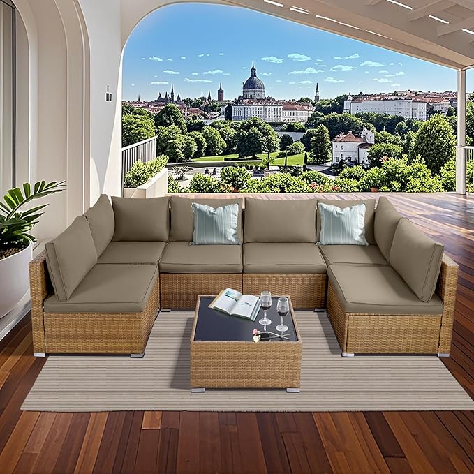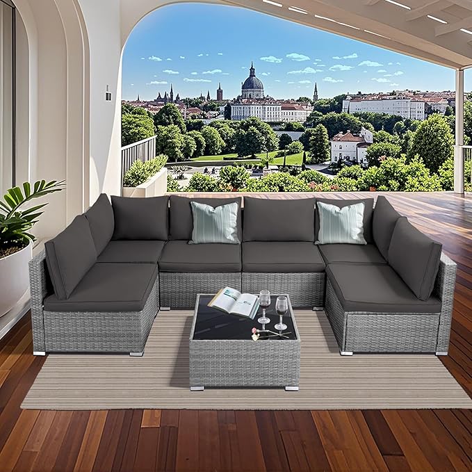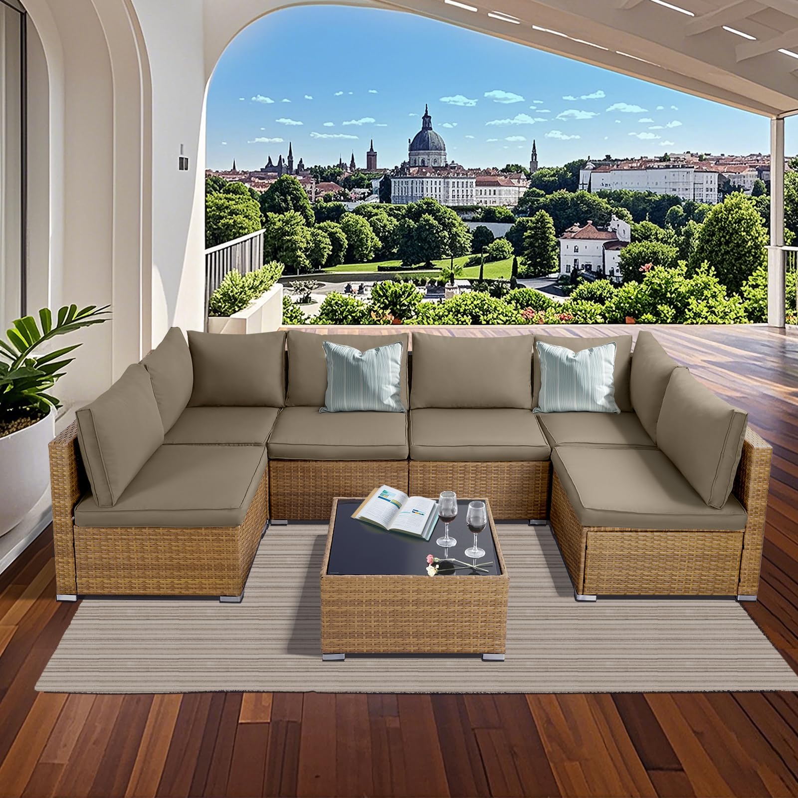 - Excellent Quality-Made of all-weather PE rattan and sturdy metal frame, 7 pieces outdoor sectional furniture won't rust or fade, durable enough for long time use. The wicker sofa set can withstand the test of time and high temperature