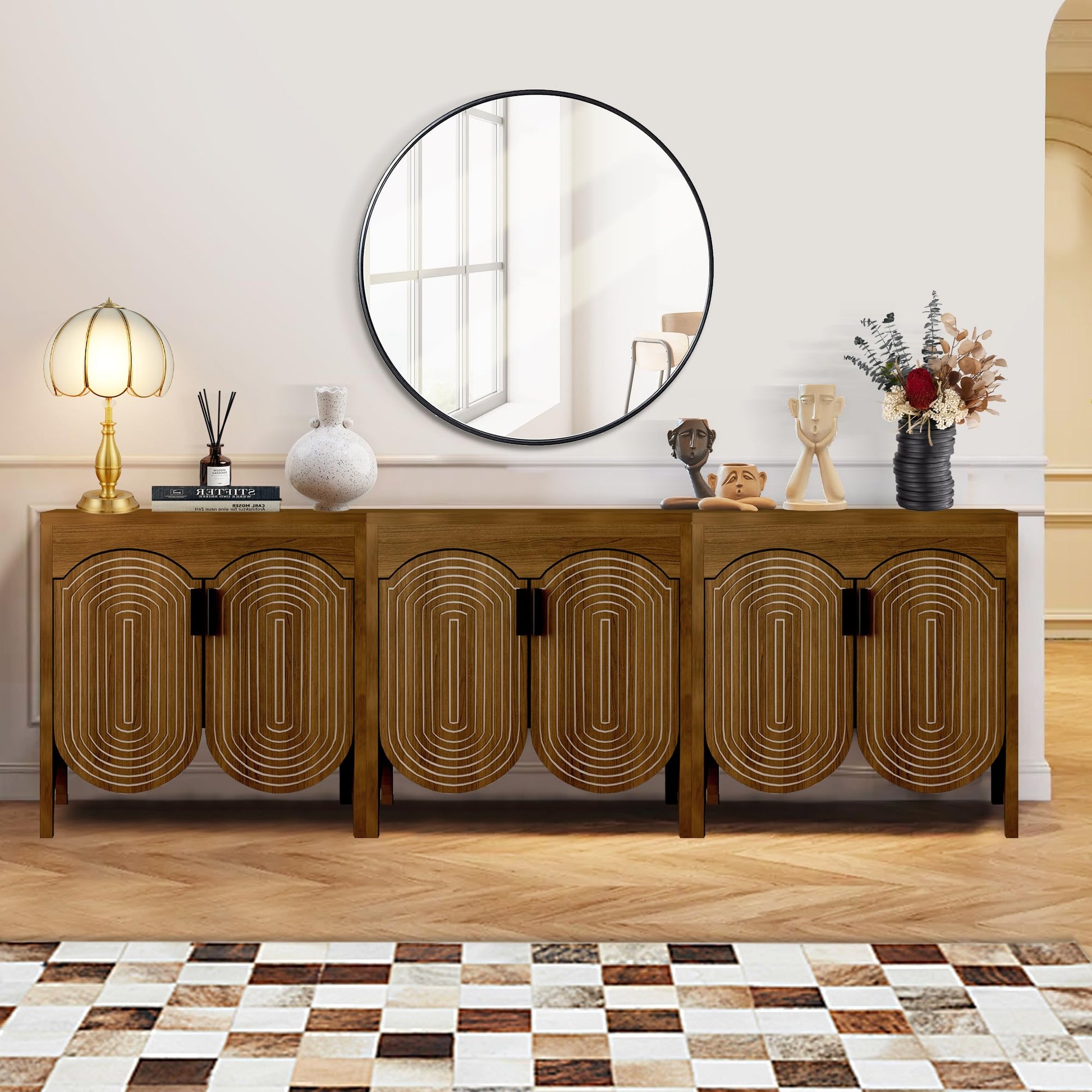 - Featuring a unique oval-shaped double groove door, this buffet cabinet adds a touch of modern elegance to any space. The sleek and smooth MDF board construction enhances its durability and ensures long-lasting use. This sideboard cabinet is not only practical but also a great addition to your home decor.