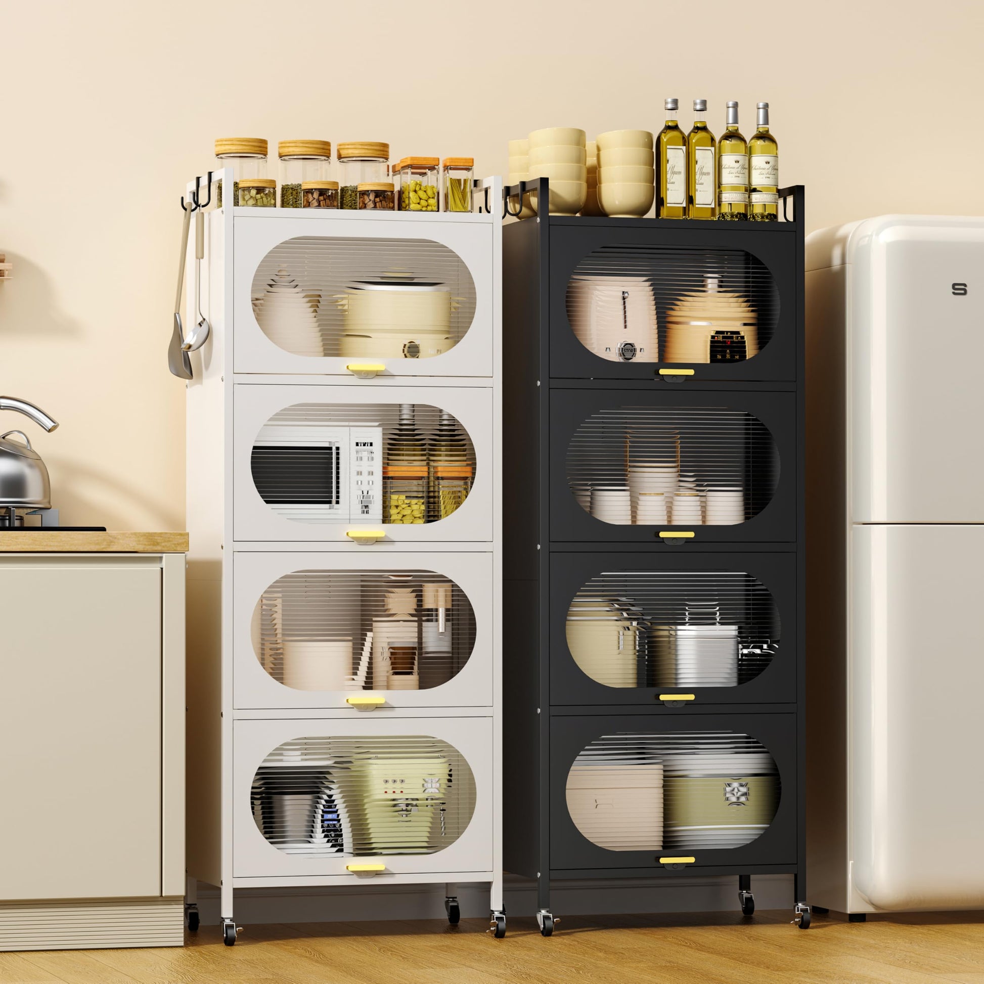 - MODERN STYLE DESIGN & AMPLE STORAGE SPACE:With a simple and modern design style, this storage cabinet with wheels can be used as a pantry cabinet, bathroom storage cabinet, entryway cabinet, etc. Whether it is placed in the kitchen, bathroom or living room, this kitchen storage cabinet blends perfectly with the surrounding environment and enhances the functionality and aesthetics of the overall space. In addition, this metal storage cabinet with doors has 4 large storage levels and an open platform that can hold many items, offering you more storage space. The cable management holes in the pantry cabinets for kitchen storage also facilitate the use of various small appliances