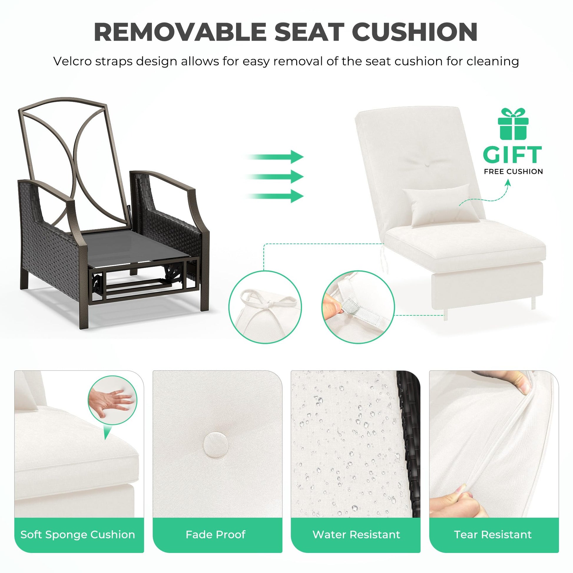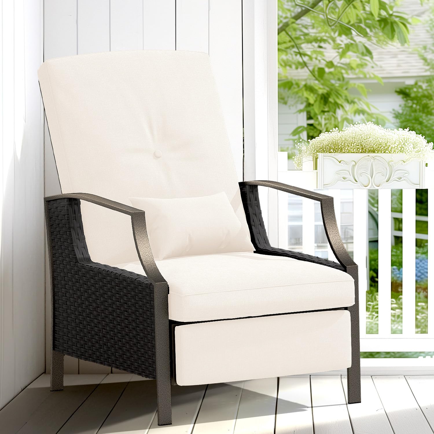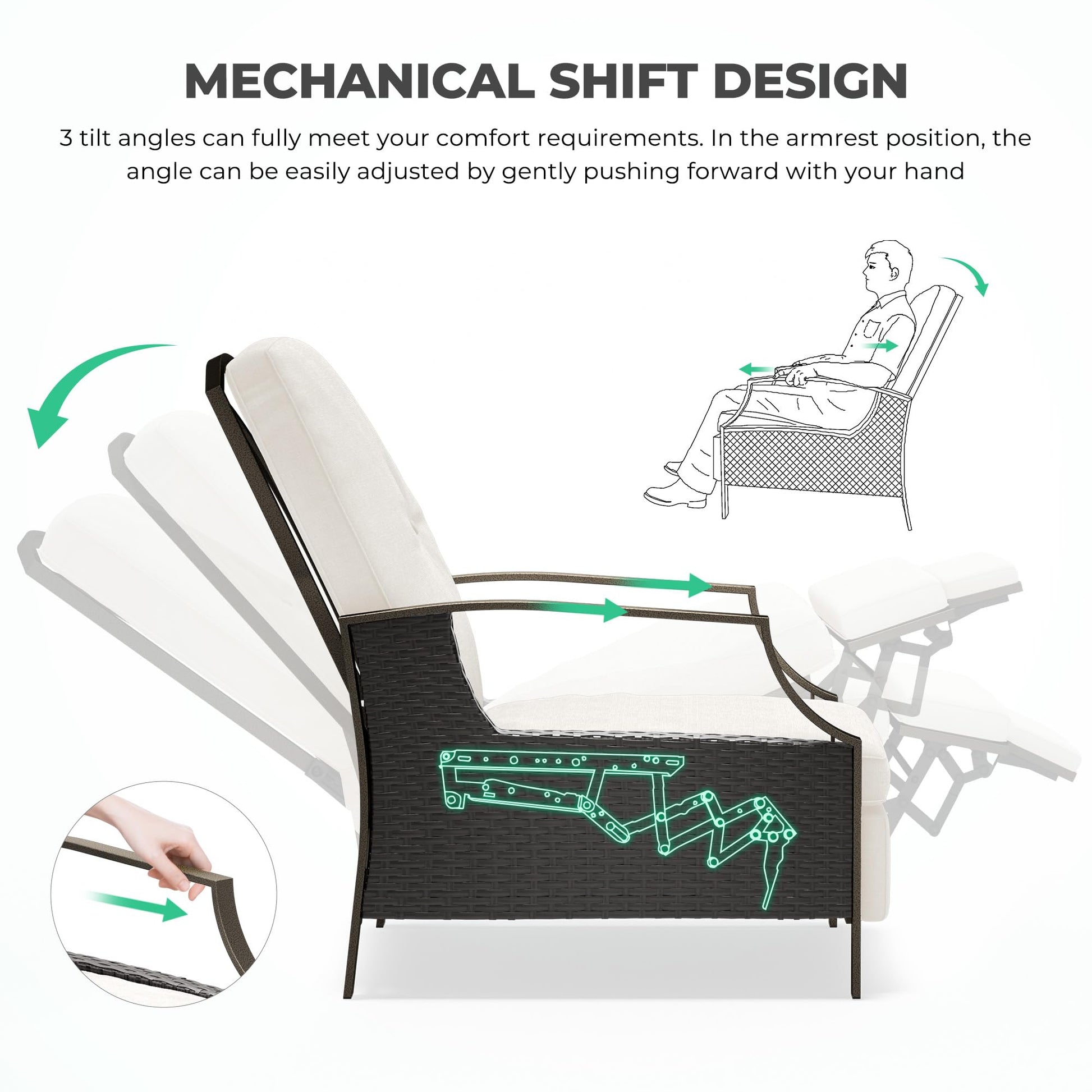 - ADJUSTABLE BACKREST: The angle of the outdoor recliner can be adjusted at any time (up to 120° tilt) by gripping the armrest position with your hands and pushing forward while leaning backward. It can meet your various activities and provide you with the most comfortable and cozy angle