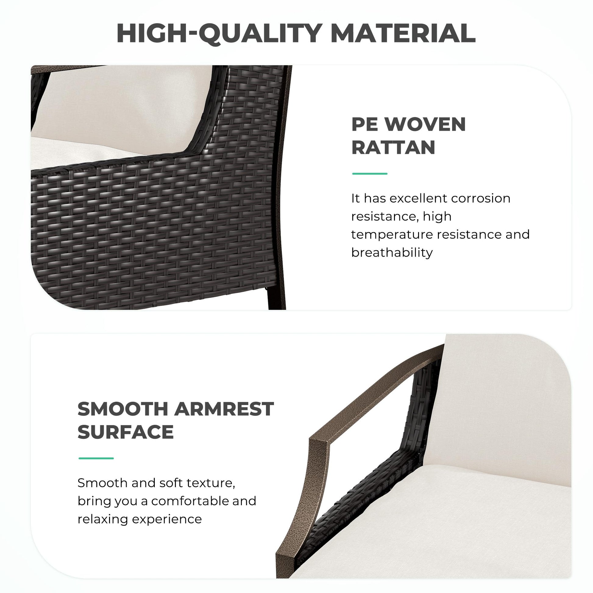 - ALL-WEATHER USEArmrests with imprinted and smooth surface, seat frame with anti-rust coating. The seat cushion is a 200G polyester fabric surface with internal sponge filling. Soft and comfortable, sun and fade-resistant for all-weather use
