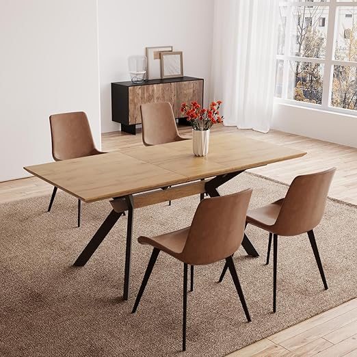 - JIEXI dining table is constructed of oak color with MDF to bring rustic style to your dining room.The 4 metal legs are highly supportive, making the table sturdy and reliable for long-term use. With upholstered dining chairs, it is both beautiful and practical, a good choice for family gatherings or parties.