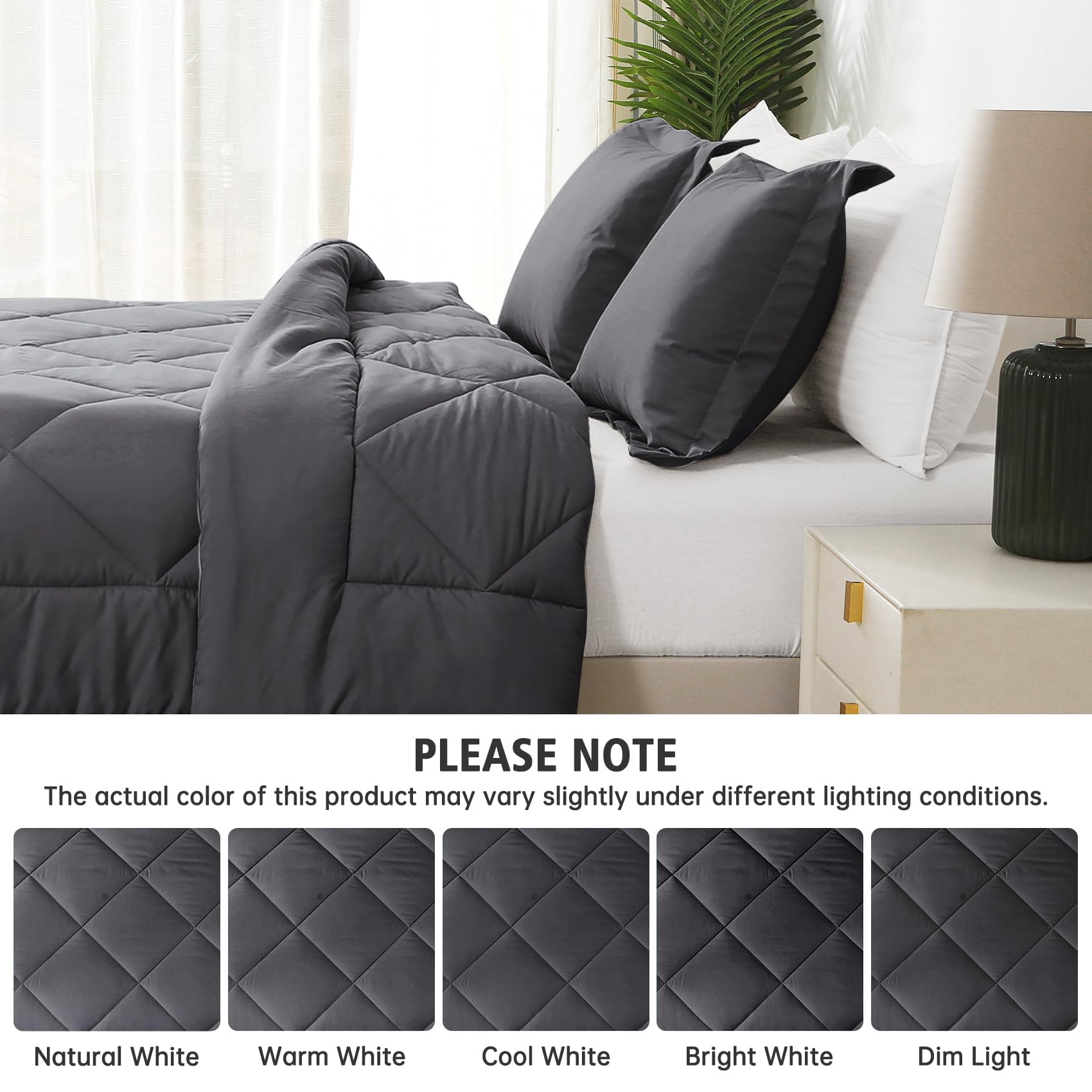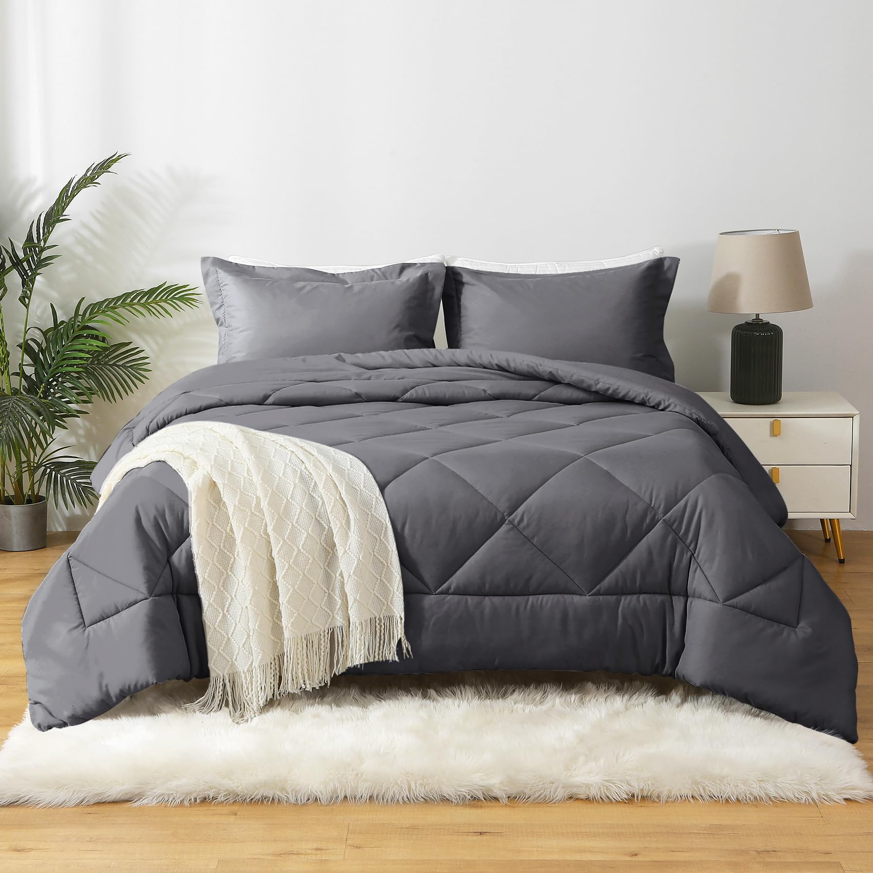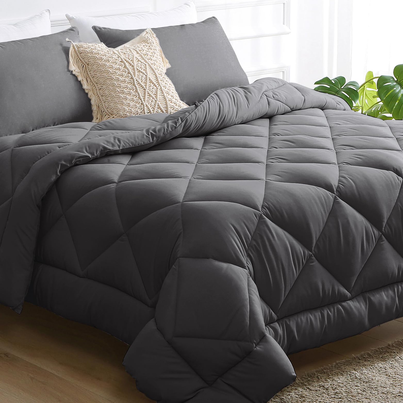 Dark Grey Queen Comforter Set, Reversible Bed in a Bag Bedding Set for All Seasons