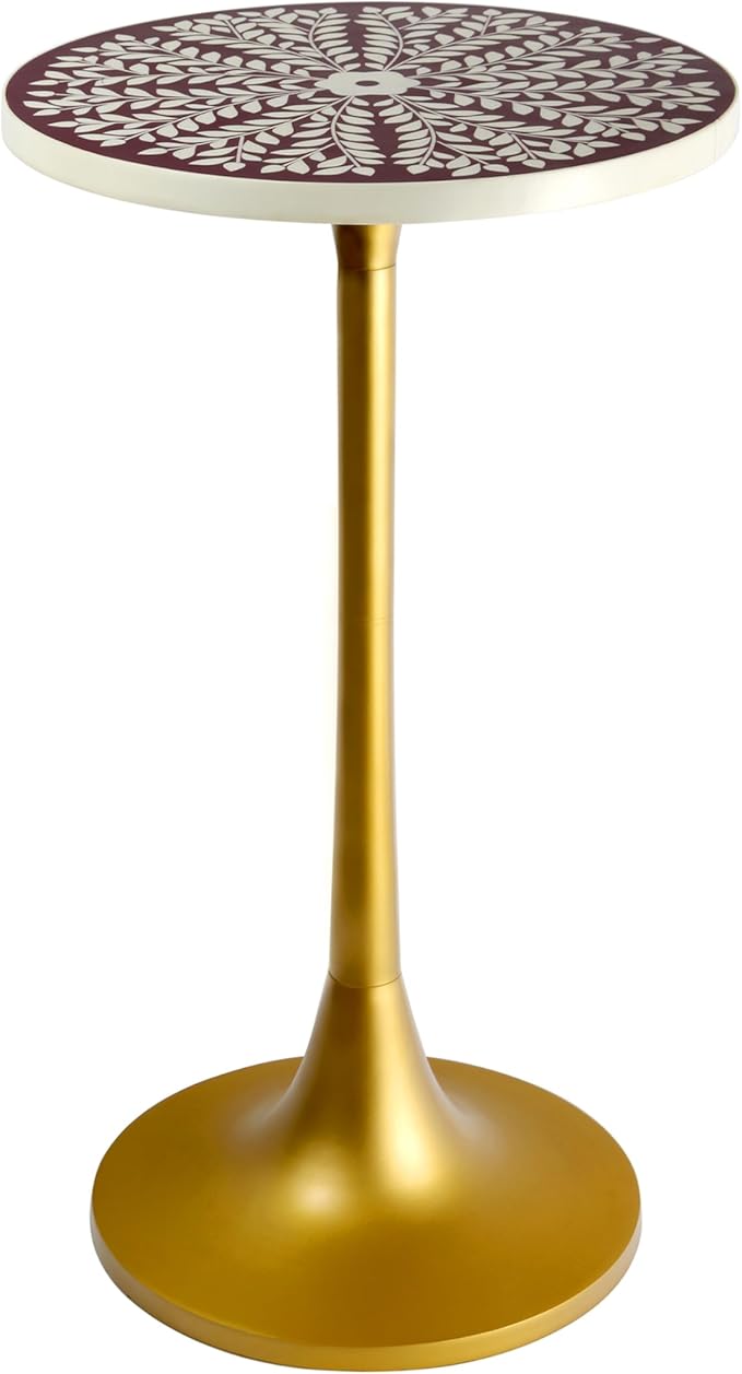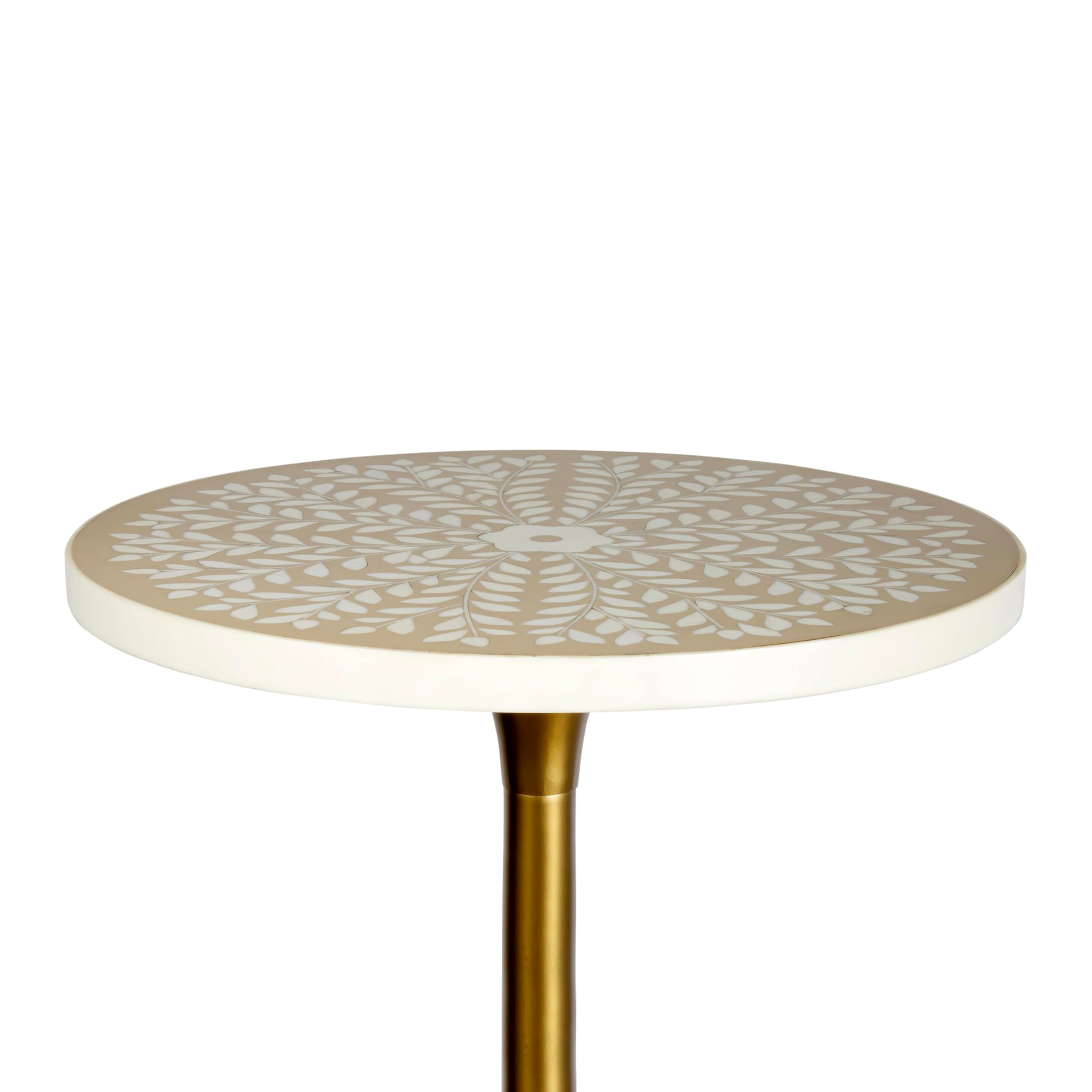 - The resin top has a two-tone vine design in beige and white, and the pedestal base is semi-glossy gold