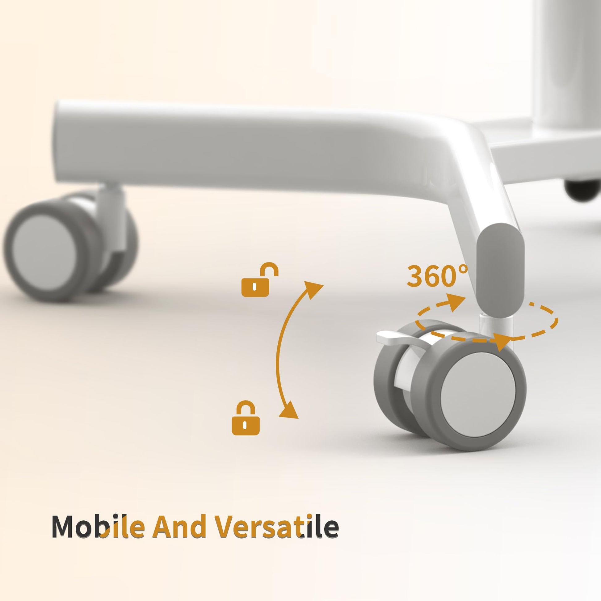 - Movable&Lockable Wheels360° rotating wheels can easily help the portable standing desk move smoothly to any corner of the home. Just lightly step on the 4 lockable wheels and it stays in place in no time. The hook on the small standing desk leg is designed for bag or earphone