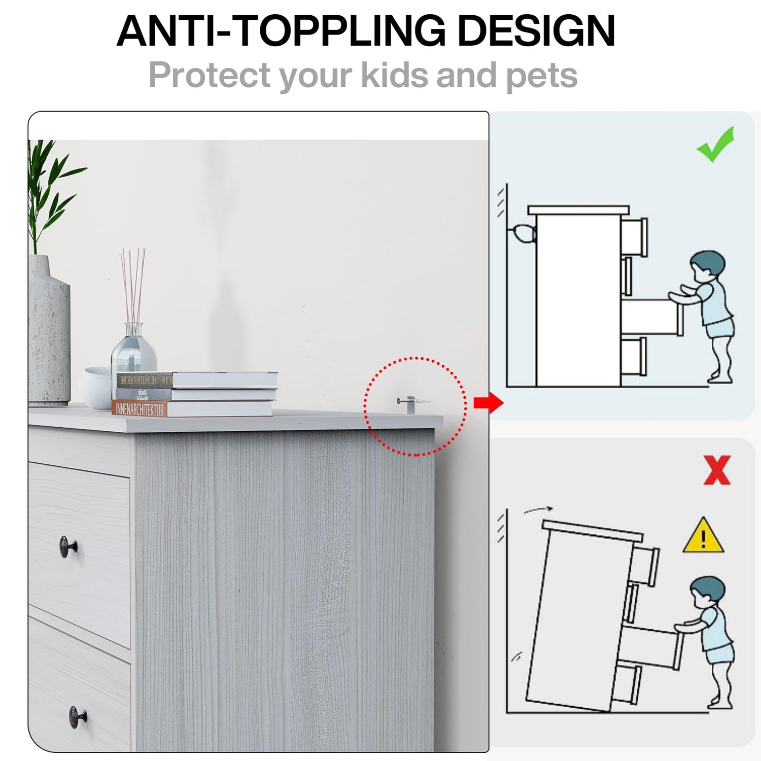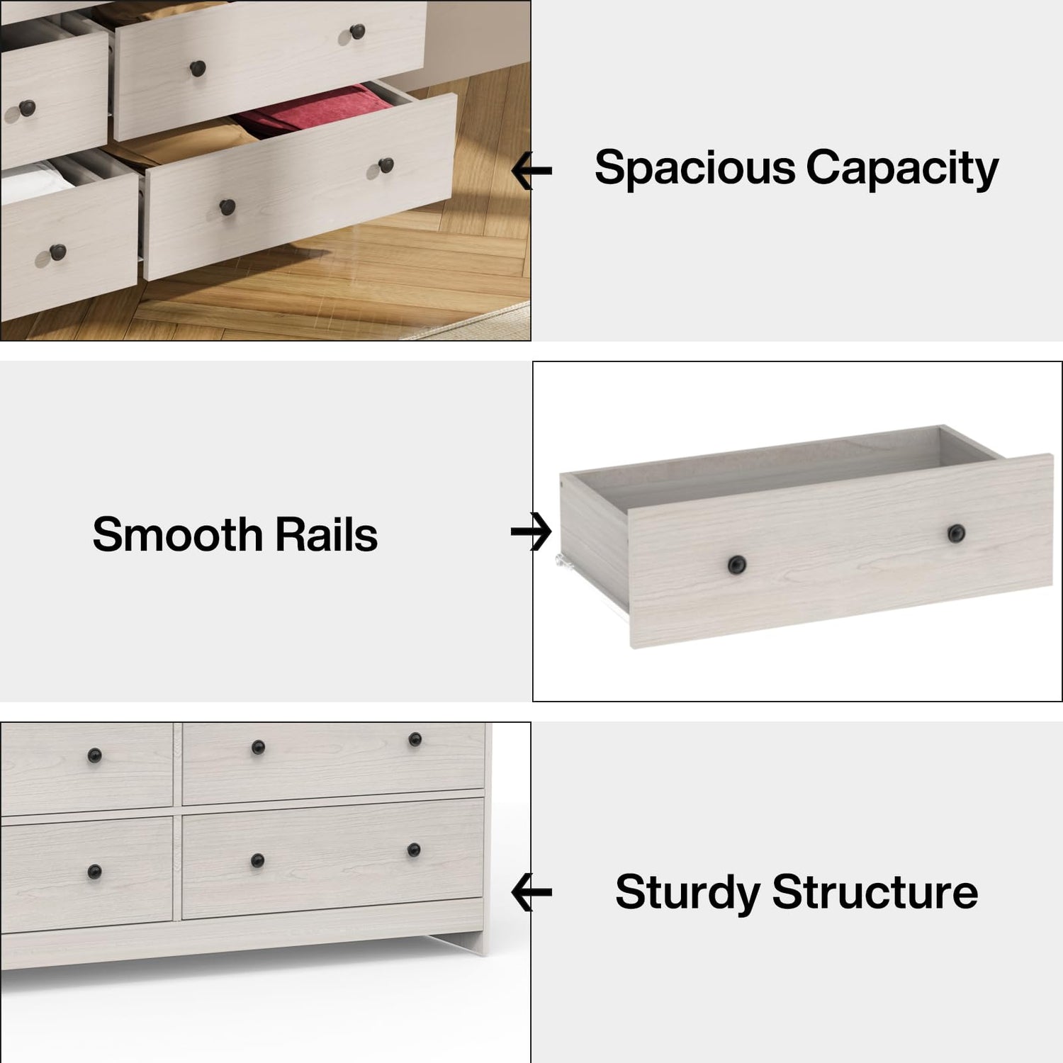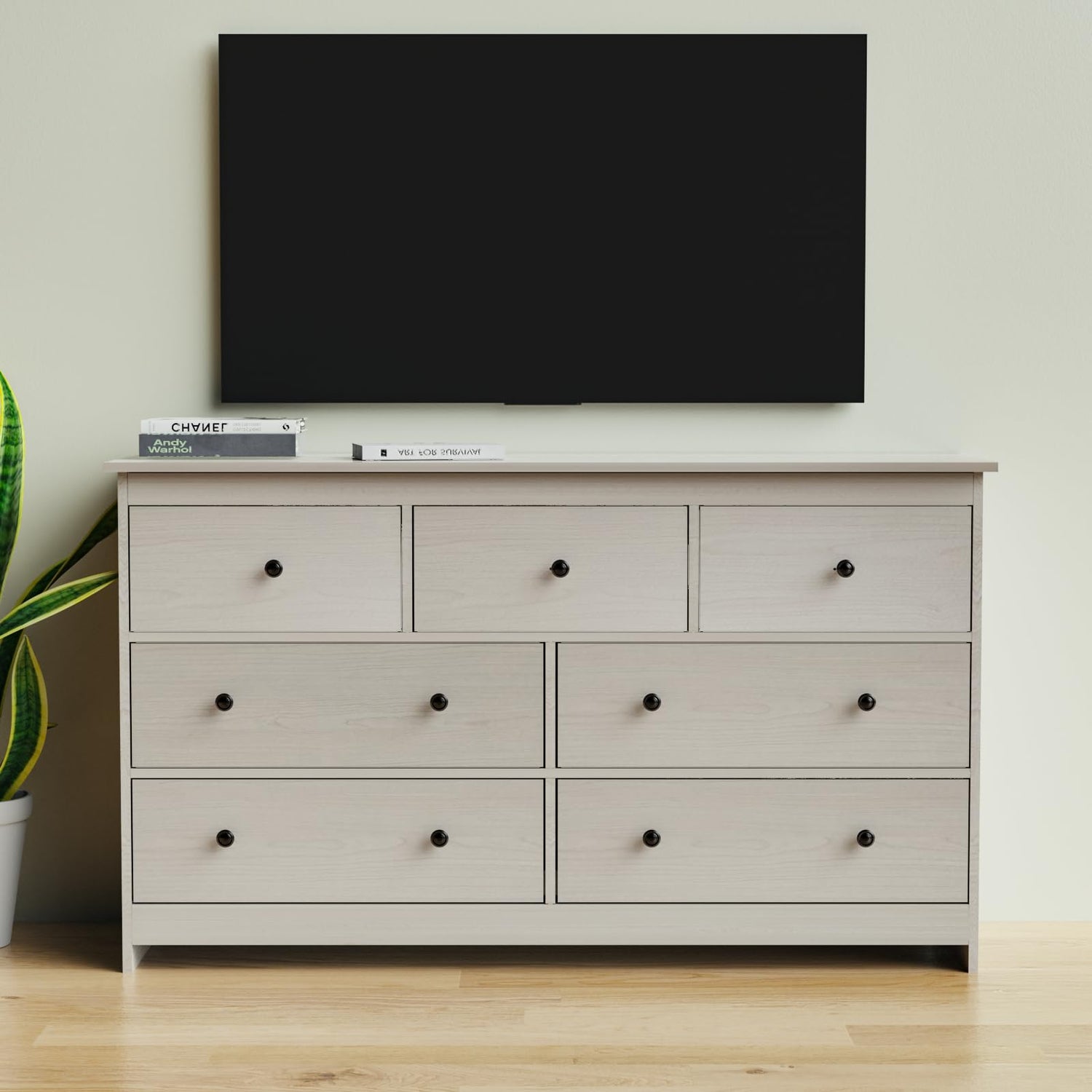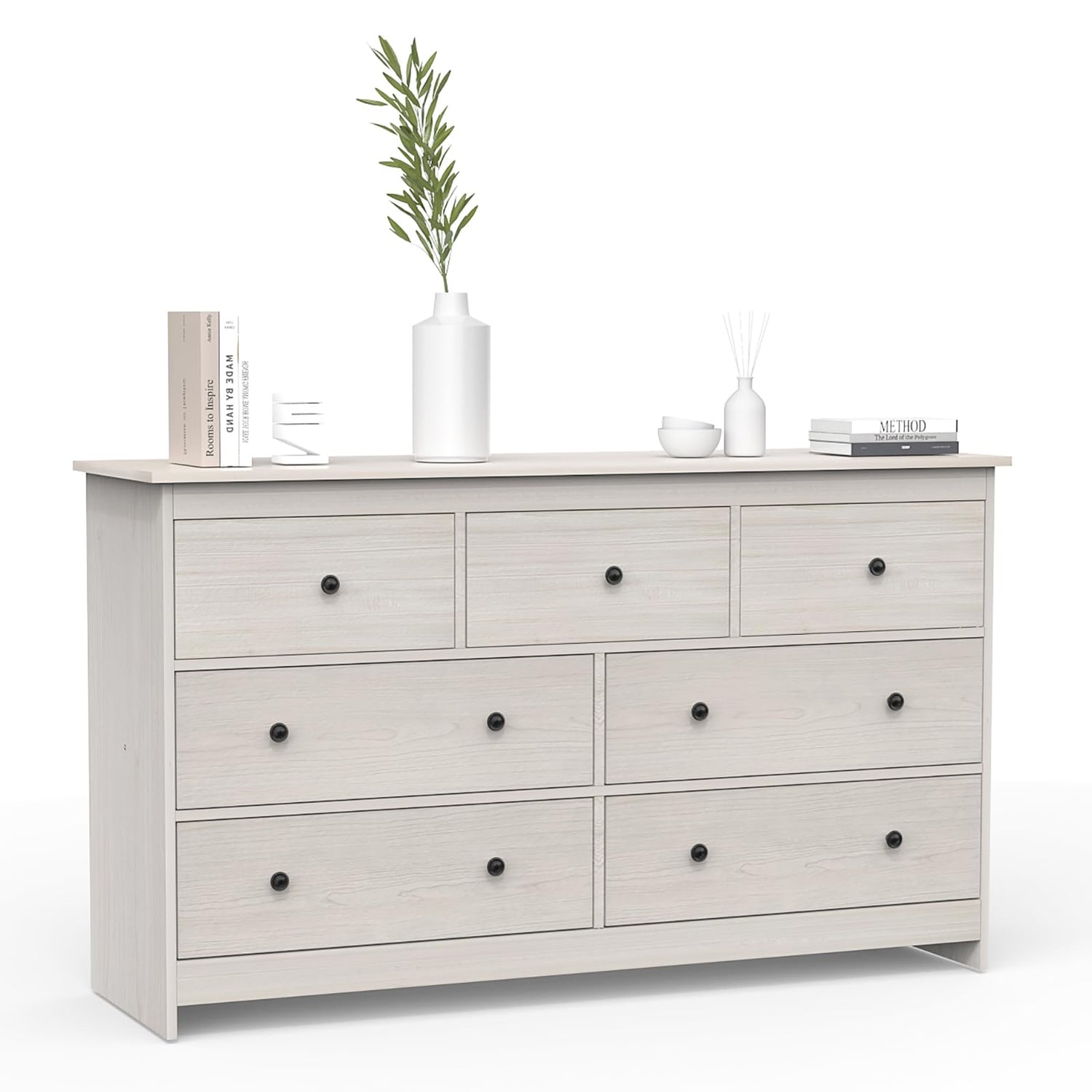 - 7 drawer wooden dresser is made of high-quality particle board for structural stability and long life. The surface is waterproof and scratch resistant, easy to clean and maintain. The bottom of the dresser is sturdily designed and equipped with an anti-toppling device, fully satisfying your quest for quality and safety.