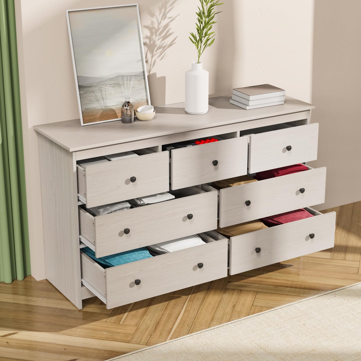 - Beige dresser measures 55.1"(W) x 15.8"(D) x 32.3"(H). The oversized top of this chest of drawers is the perfect place to display decor, photos, plants, and more. It also has 3 small drawers and 4 large drawers to store and sort clothes, books, toys, and other household items. This large storage capacity dresser covers all your storage needs to keep your room neat and organized.