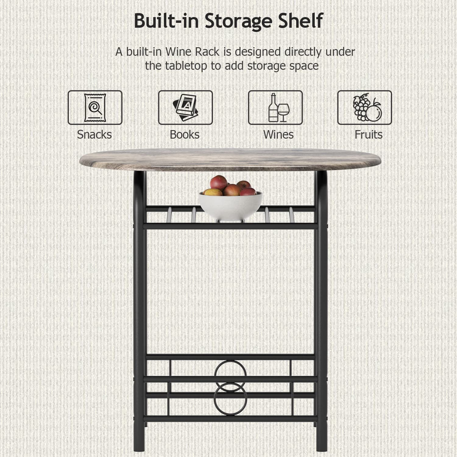 3-Piece Wooden Round Table & Chair Set, Space Saving Kitchen Breakfast Nook Wood Grain Tabletop with Metal Frame and Built-in Wine Rack for Kitchen,