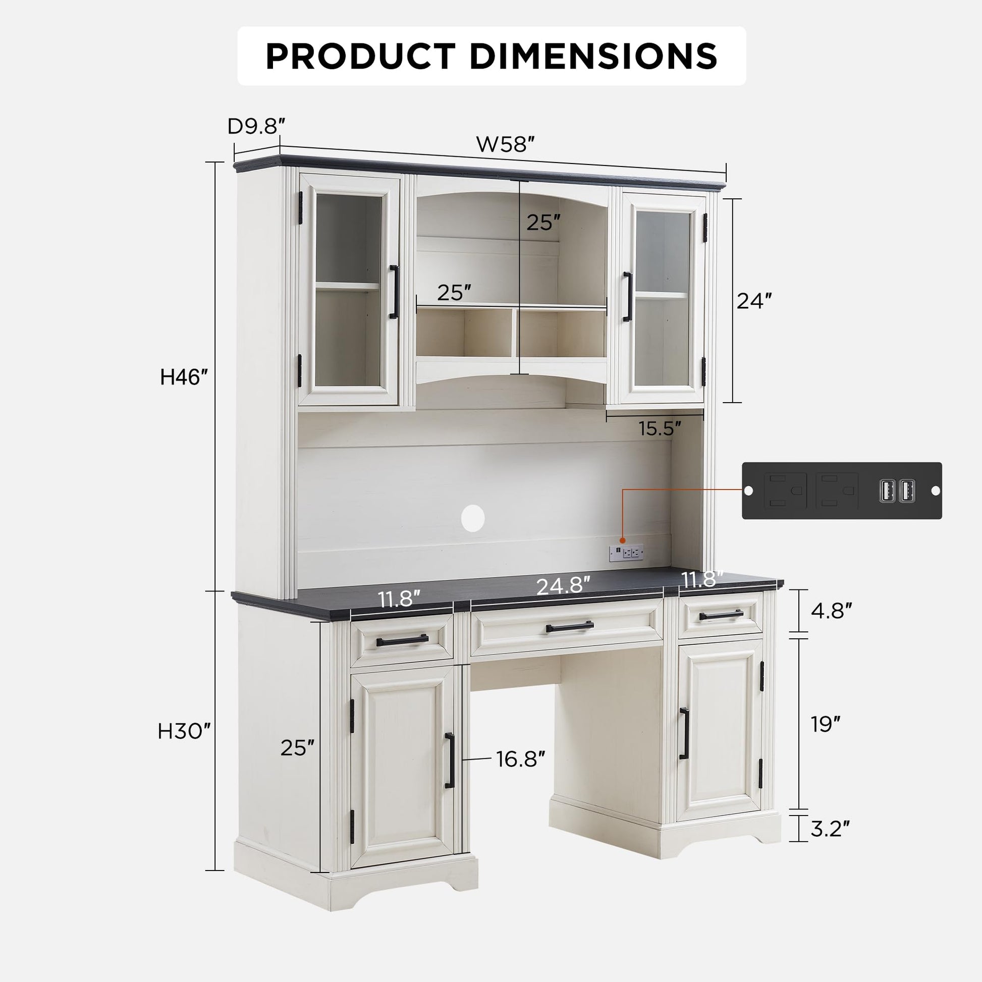 Farmhouse 76" Height Computer Desk with Hutch, Office Desk with Charging Station, Drawers and Storage Cabinet, Workstation for Office Home, Off White