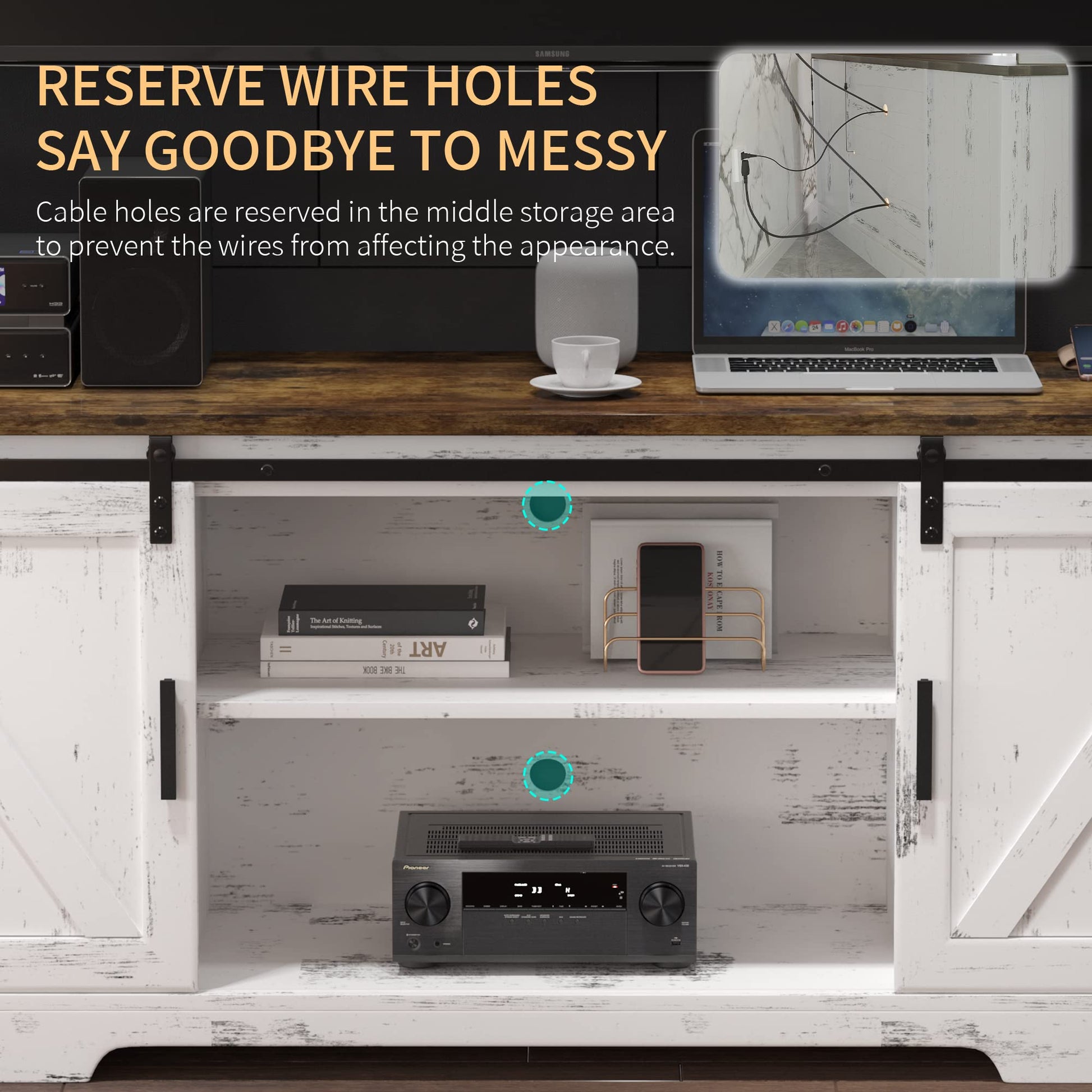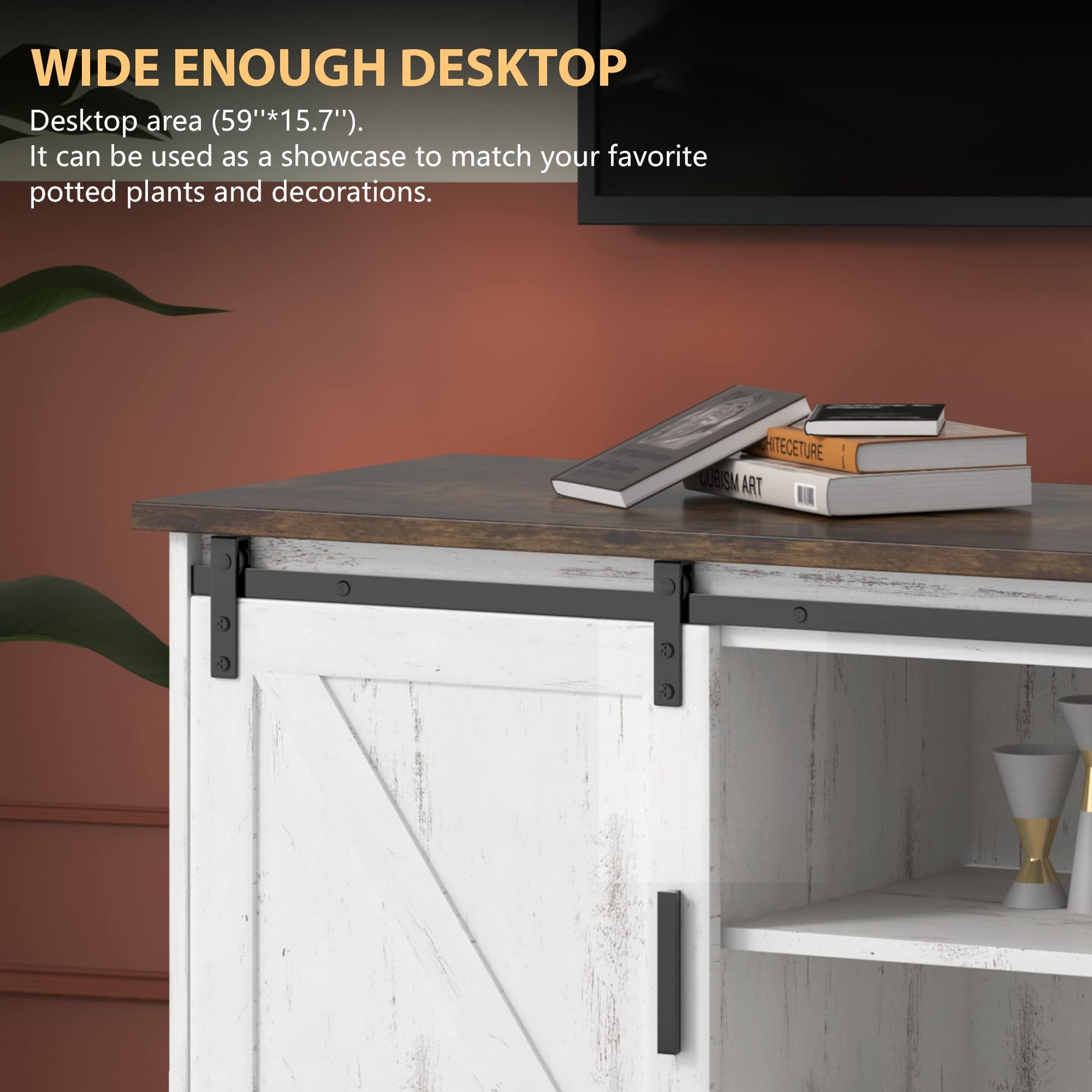 - White TV Stand Size: 59"L X 15.7"W X 23.6"H. Antique color table top + White cabinet + Thickened Solid Wood + Round wiring hole + Adjustable shelf. Durable, beautiful and valuable.