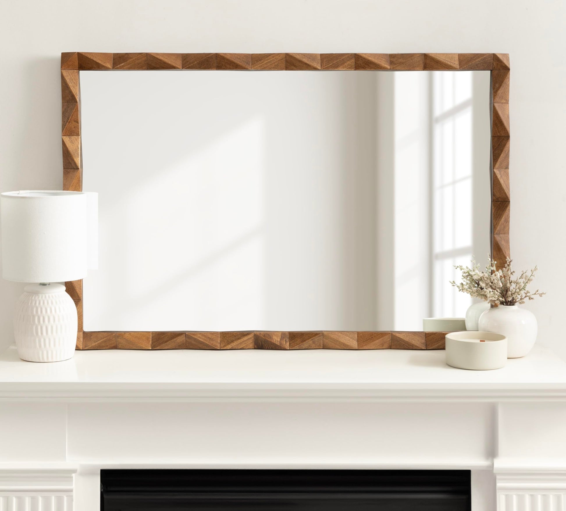 - Modern Pieced Wood Mirror: This eclectic rectangle mirror has a youthful faceted wooden frame that gives your space a touch of geometric dimension