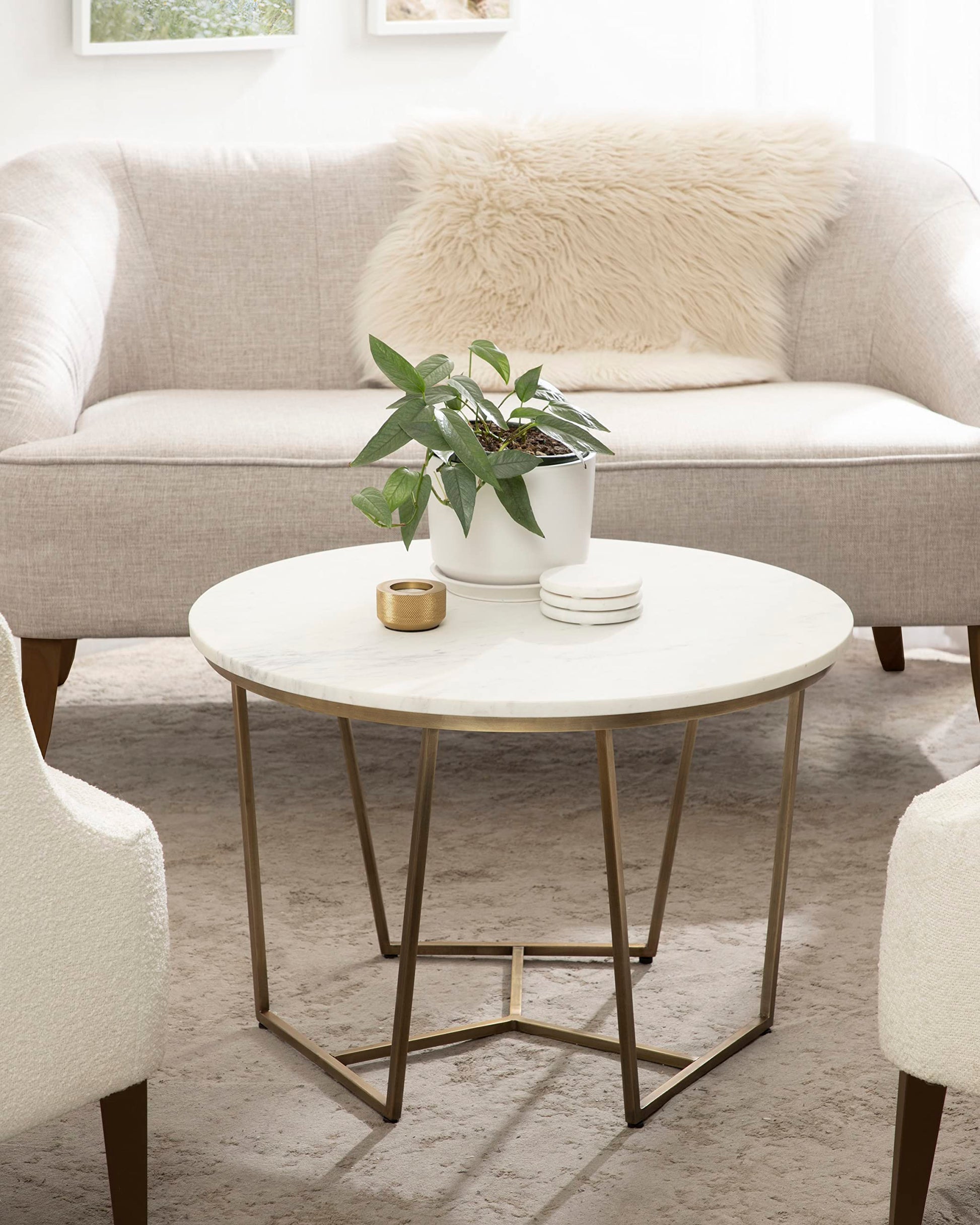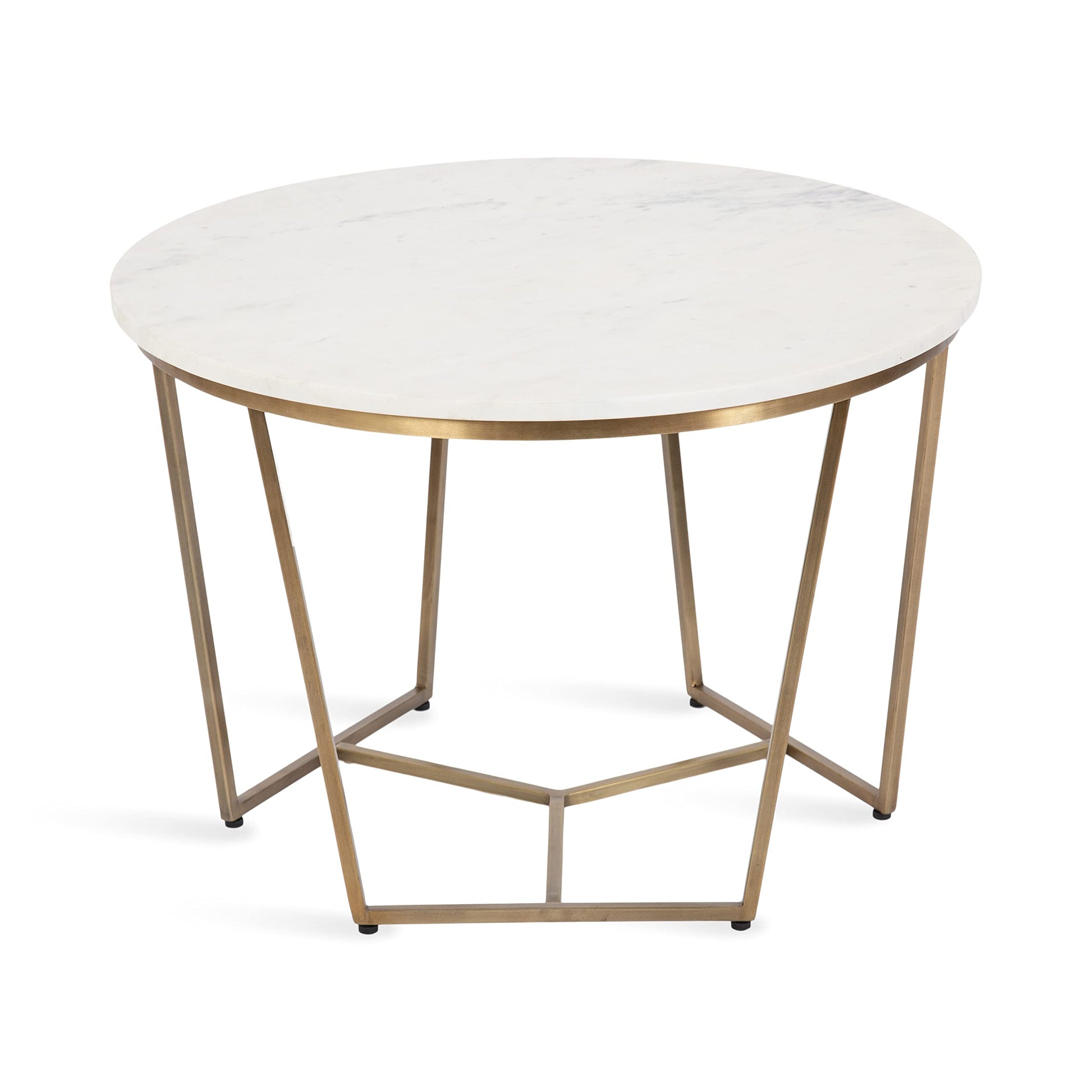 - Modern Glam Table: Inspired by contemporary, dimensional details, the Solvay features a two-tone white marble and brass finish in addition to a bold geometric frame and a round tabletop