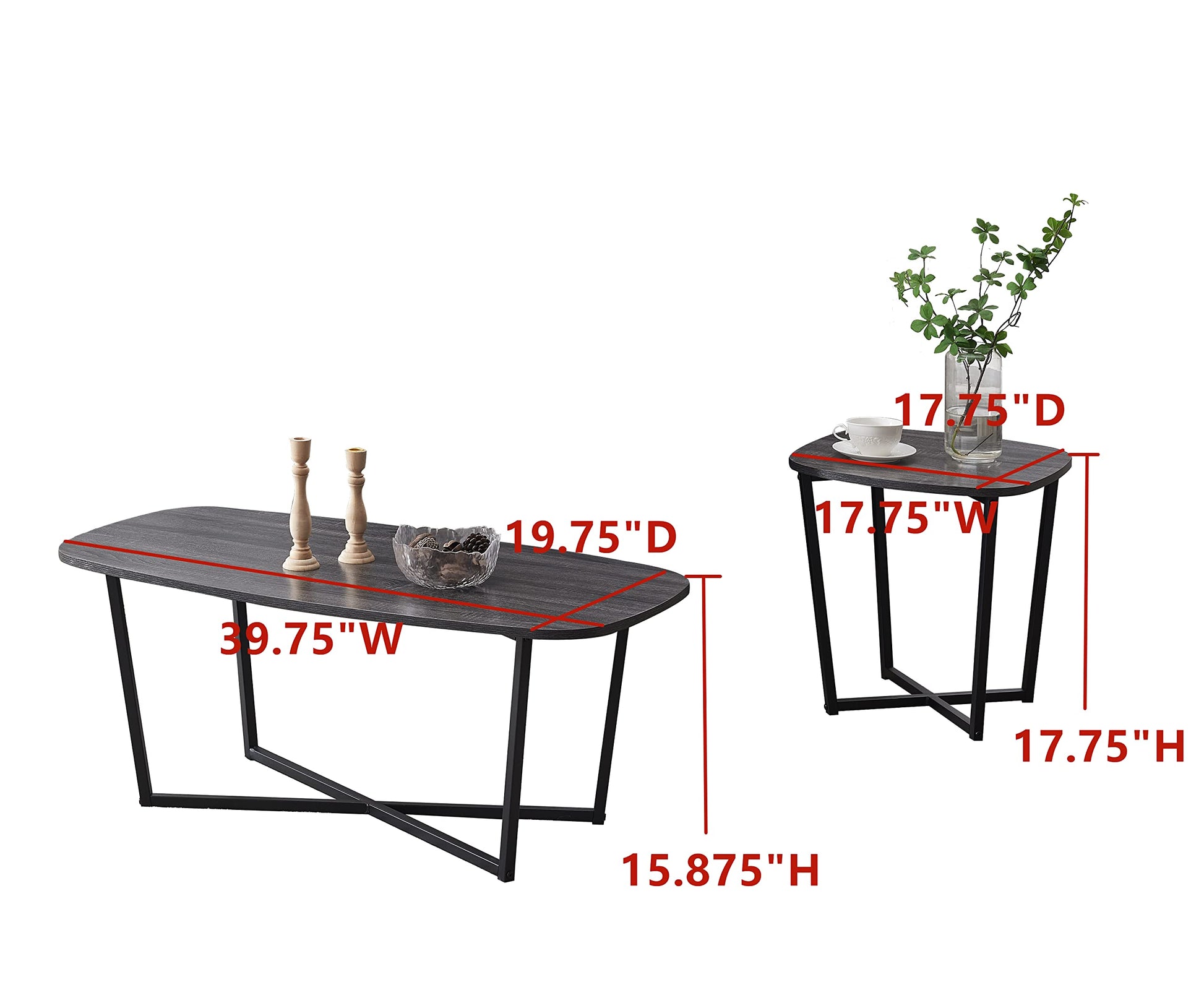 - Dimensions: Coffee Table: 39.75"W x 19.75"D x 15.875"H. End Table: 17.75"W x 17.75"D x 17.75"H