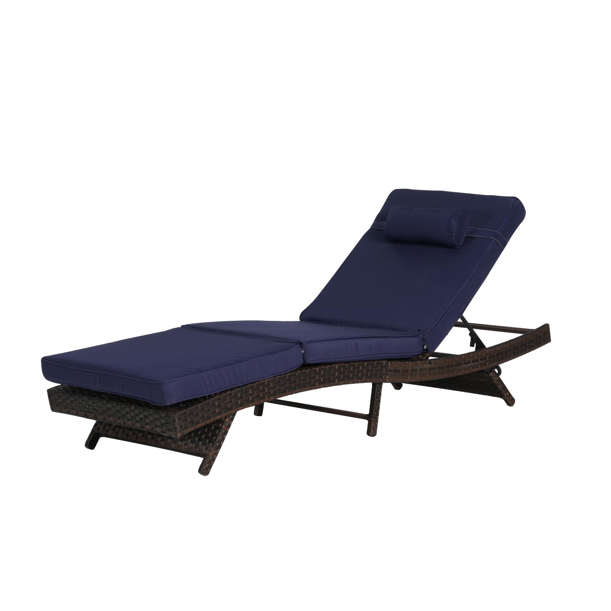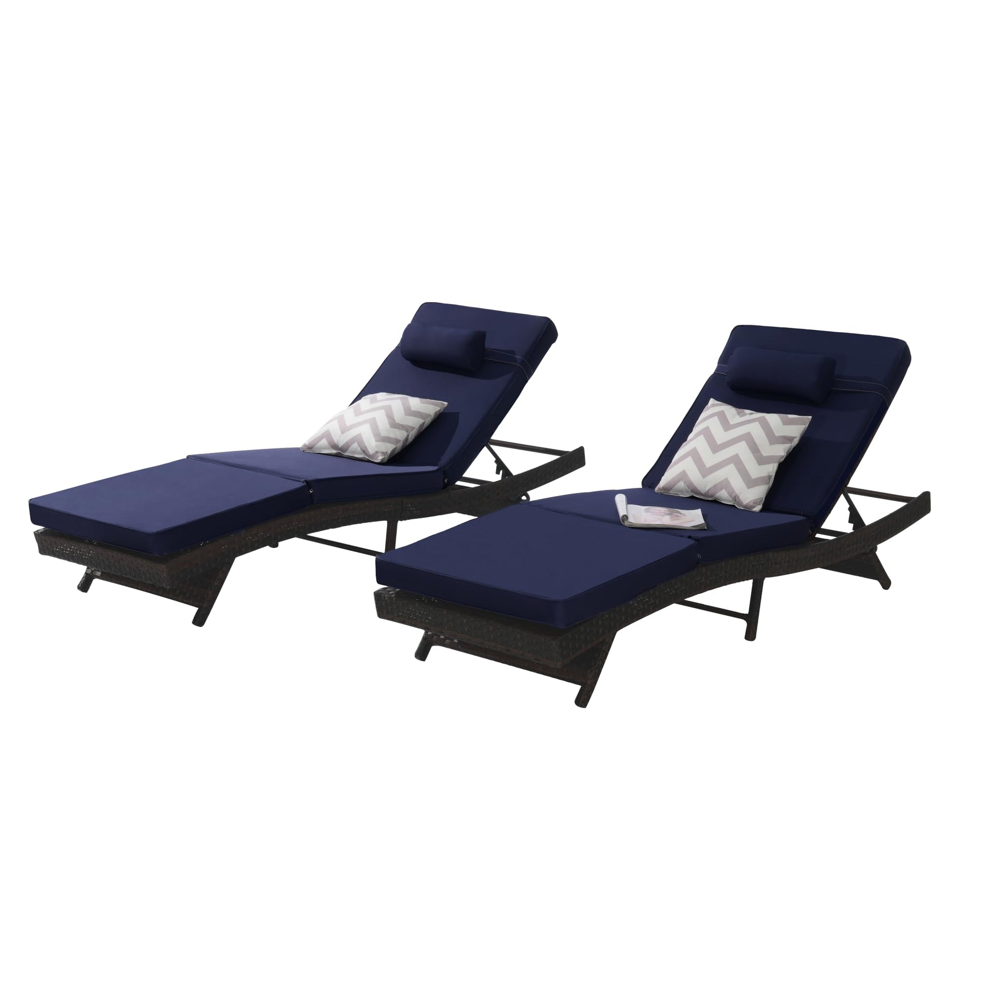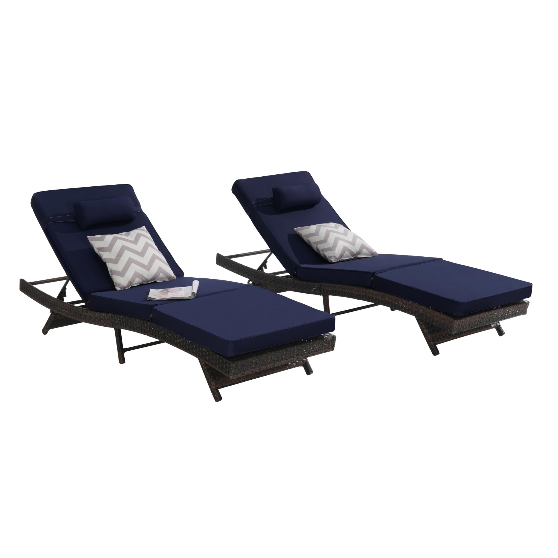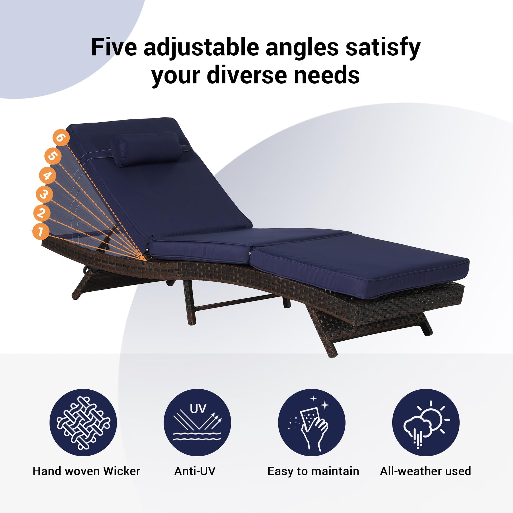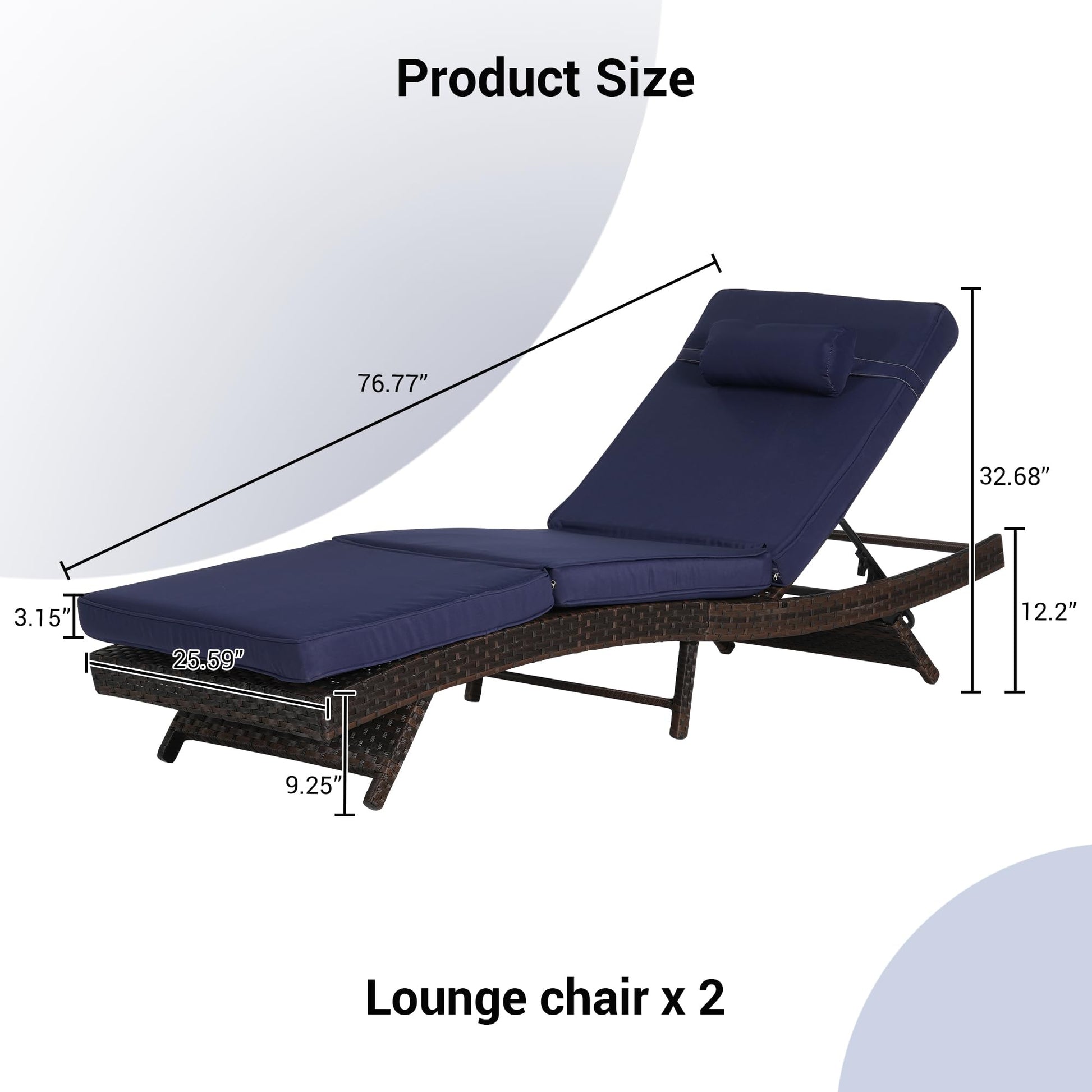 KEIKI Outdoor Long Reclining Chair Set of 2, PE Wicker Chaise Lounge Chairs with 5-Level Adjustable Backrest, Sunbathing Chairs Recliner up to 150° for Poolside, Garden, Beach, Deck, Dark Blue
