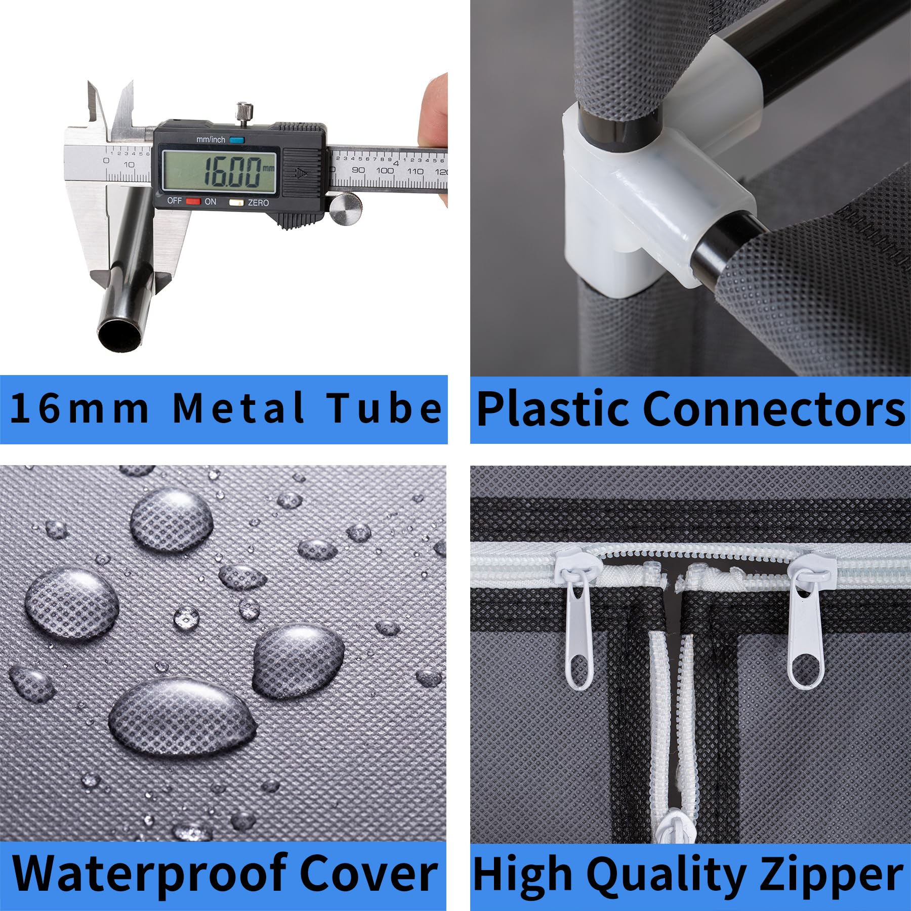 - The closet is made of high-quality materials such as a 16mm diameter round tube and PP plastic connectors. The sturdy frame and reinforced joints make the wardrobe organizer durable and stable, ensuring long-lasting use.