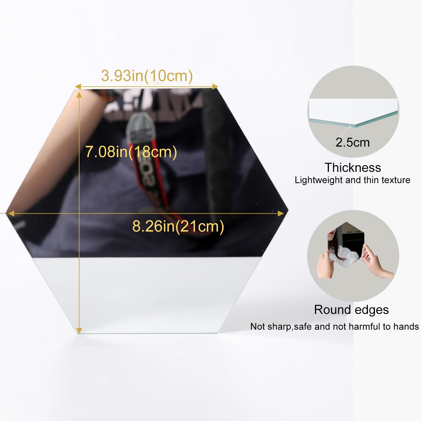 - These mirror title stickers are hexagonal shape, the side length is 10cm and the thickness is 2.5mm. Lightweight and durable. Just peel off the double-sided tape on the back and stick them on smooth surfaces such as tiles, walls, doors, windows and cabinets.